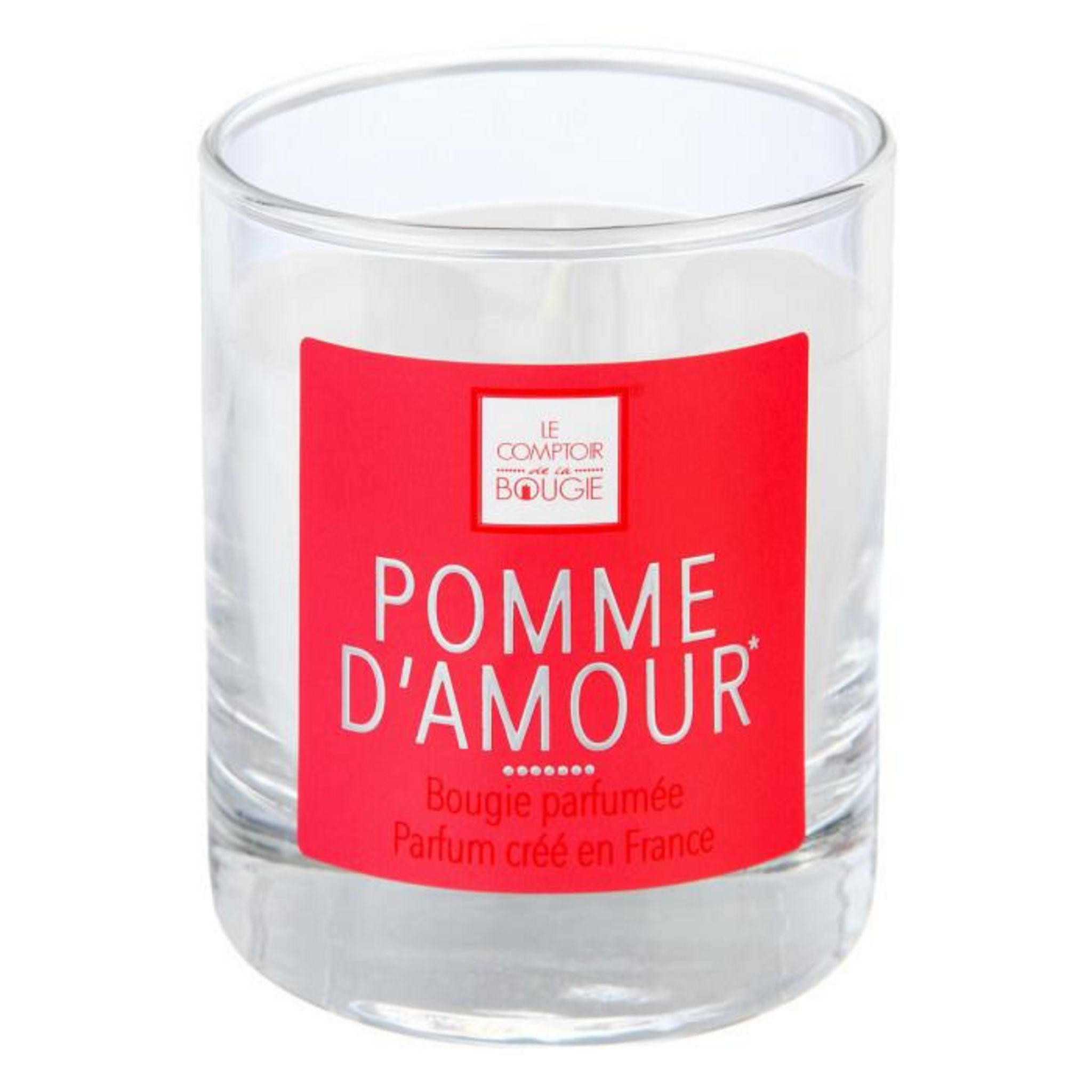 Informations Techniques : Dimensions : D. 8 x H. 9,5 cm Matières : Verre & Cire Spécificités : Déco & Utile Bougie parfumée Parfum crée en France Senteur : Pomme d'Amour Durée de combustion : 47 heures Contenance : 190 g Poids : 0,51 kg Couleur : Rouge & Transparent