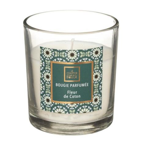 Informations Techniques : Dimensions : L. 7 x l. 6,5 x H. 8 cm Matières : Paraffine & Verre Spécificités : Pratique & Design Bougie Parfumée Bougie en Verrine 1 Mèche Senteur : Fleur de Coton Couleur : Blanc