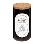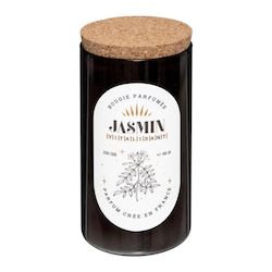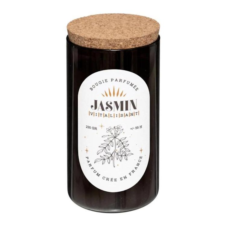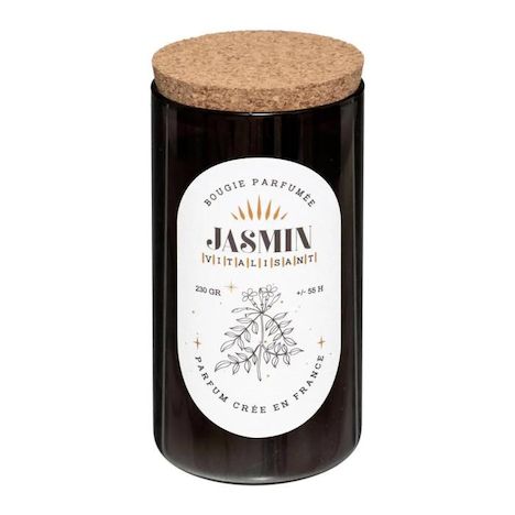 Informations Techniques : Dimensions : D. 6,5 x H. 12,8 cm Matières : Verre & Cire Spécificités : Tendance & Déco Bougie Parfumée Forme Ronde % de Parfum : 5 % Durée de Combustion : 55 heures Senteur : Jasmin Parfum crée en France Poids : 0,332 kg Couleur : Noir