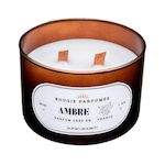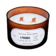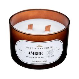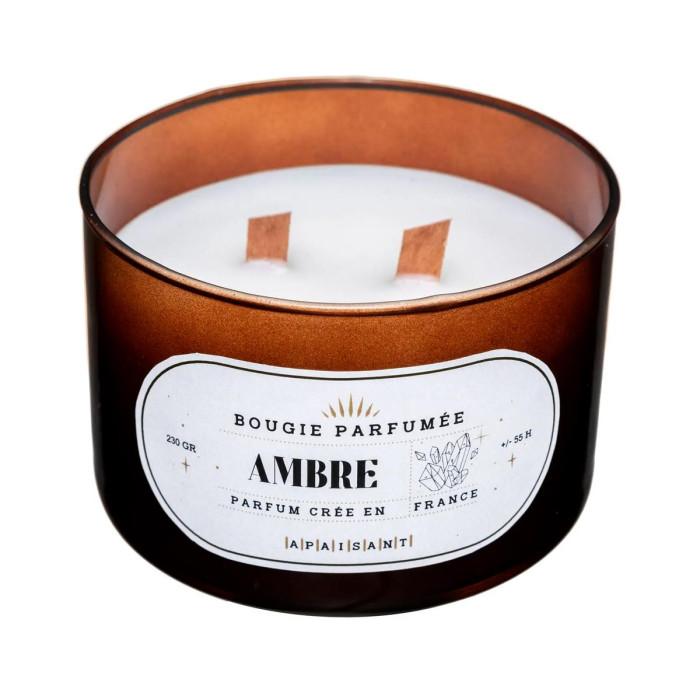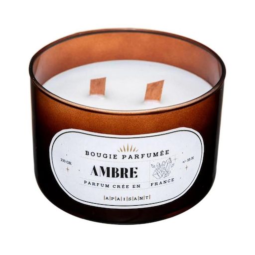 Informations Techniques : Dimensions : D. 12 x H. 8 cm Matières : Verre & Cire Spécificités : Tendance & Déco Bougie Parfumée Forme Ronde 2 Mèches % de Parfum : 5 % Durée de Combustion : 20 heures Senteur : Ambre Parfum crée en France Poids : 0,649 kg Couleur : Marron