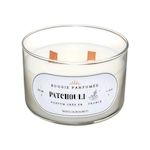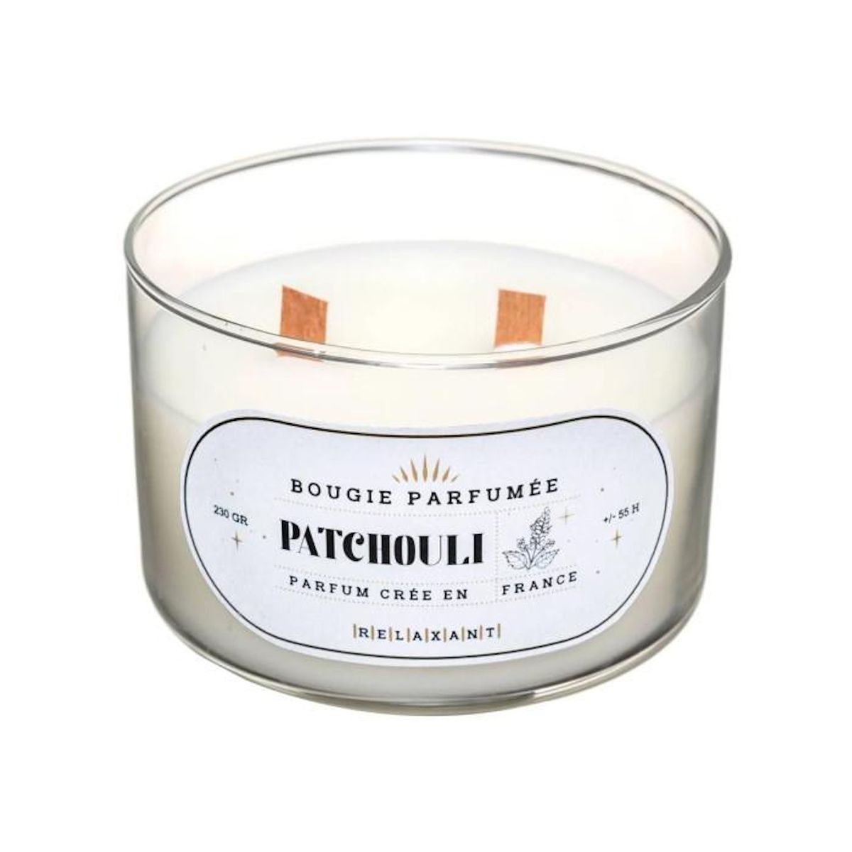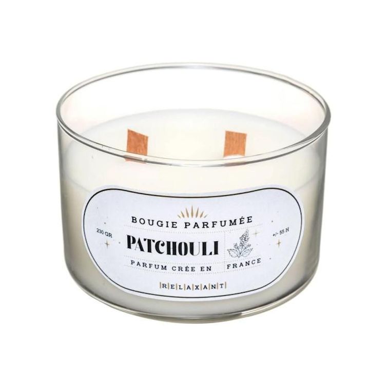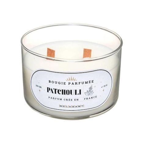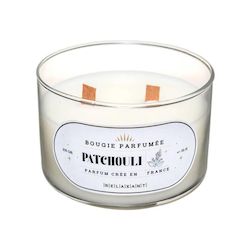Informations Techniques : Dimensions : D. 12 x H. 8 cm Matières : Verre & Cire Spécificités : Tendance & Déco Bougie Parfumée Forme Ronde 2 Mèches % de Parfum : 5 % Durée de Combustion : 20 heures Senteur : Patchouli Parfum crée en France Poids : 0,649 kg Couleur : Blanc