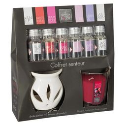 Informations Techniques : Dimensions : Produit emballé : L. 20 x P. 5 x H. 23 cm Brûle-parfum : D. 7,9 x H. 8 cm Bougie : D. 6,2 x H. 7,5 cm Flacon d'huile parfumée : D. 2,5 x H. 5,8 cm Matières : Dolomite, Verre, Huile & Cire Spécificités : Design & Tendance 8 Pièces Parfum Bougie : Fruit Rouge P