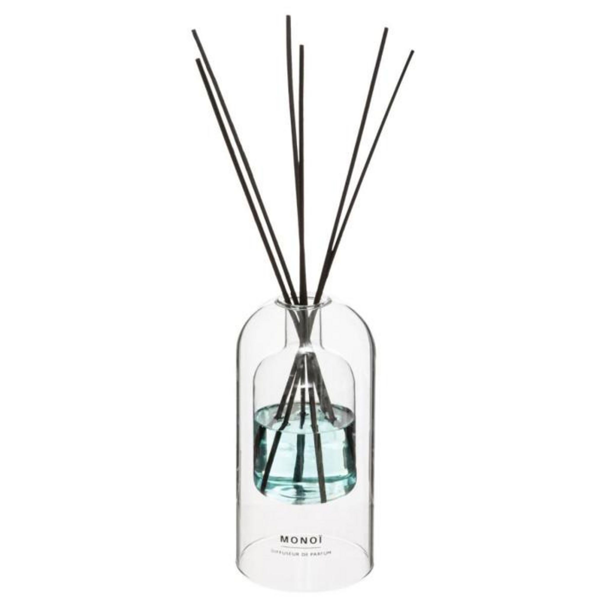 Informations Techniques : Dimensions : D. 8 x H. 33 cm Bâtonnets : H. 28 cm Recharge : D. 5 x H. 11 cm Matières : Verre & Huile Spécificités : Contenance : 150 ml Délicat & Parfumé Senteur : Monoï Livré avec des bâtonnets Couleur : Bleu