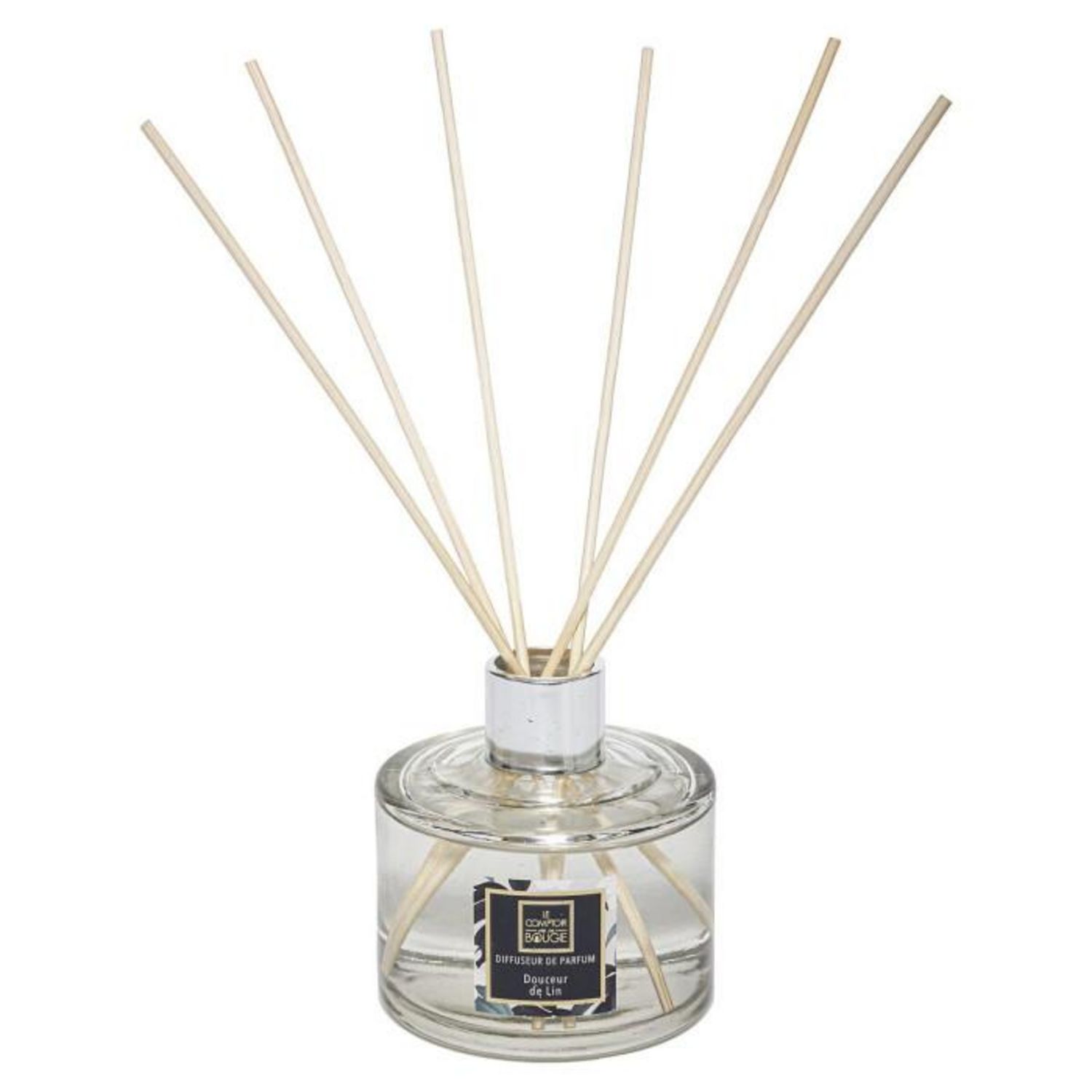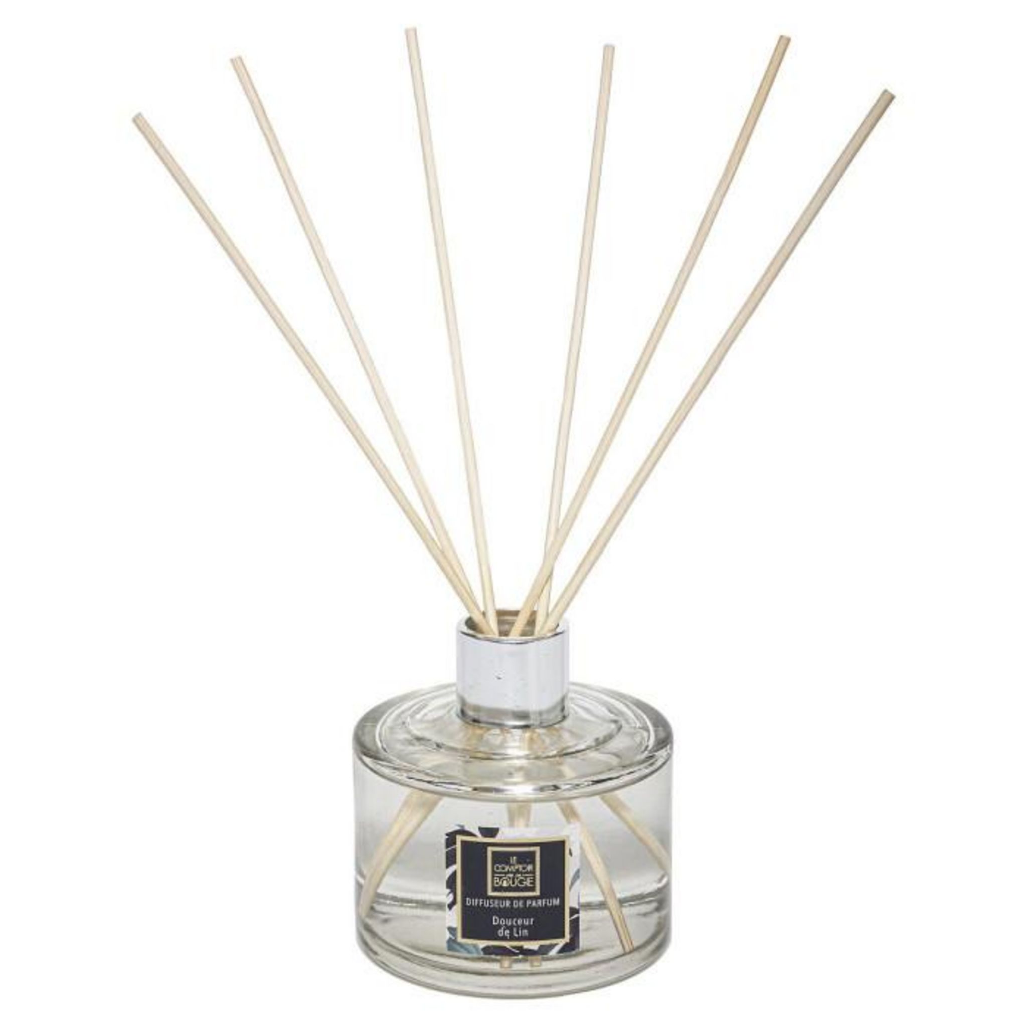 Informations Techniques : Dimensions : D. 8,4 x H. 25 cm Matières : Verre & Huile Spécificités : Design & Tendance Senteur : Lin Poids : 0,537 kg Couleur : Beige