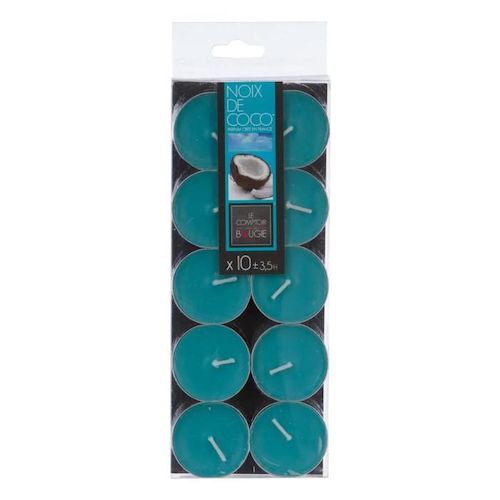 Informations Techniques : Dimensions : D. 3,7 x H. 1,5 cm Matières : Cire & Aluminium Spécificités : Vendu par lot de 10 Parfum : Coco Poids : 0,012 kg Couleur : Bleu