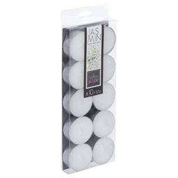 Informations Techniques : Dimensions : D. 3,7 x H. 1,5 cm Matières : Cire & Aluminium Spécificités : Vendu par lot de 10 Parfum : Jasmin Poids : 0,012 kg Couleur : Blanc