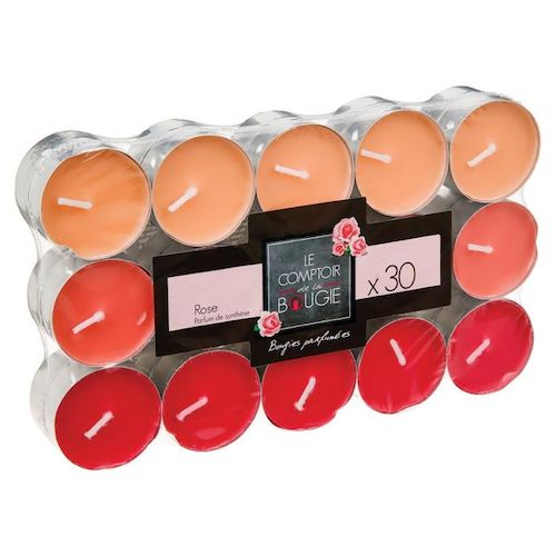 Informations Techniques : Dimensions : D. 3,7 x H. 1,2 cm Matière : Paraffine Spécificités : Utile & Pratique Lot de 30 bougies parfumées chauffe-plat Senteur : Rose Durée de combustion : 3,5 heures Capacité : 350 g Poids : 0,25 kg Couleur : Rose