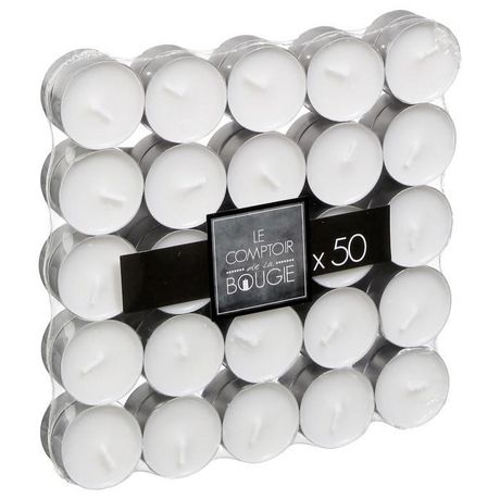 Informations Techniques : Dimensions : D. 3,7 x H. 1,8 cm Matières : Cire Spécificités : Pratique & astucieux Coupelle en aluminium Vendu par lot de 50 Poids : 0,011 kg Couleur : Blanc