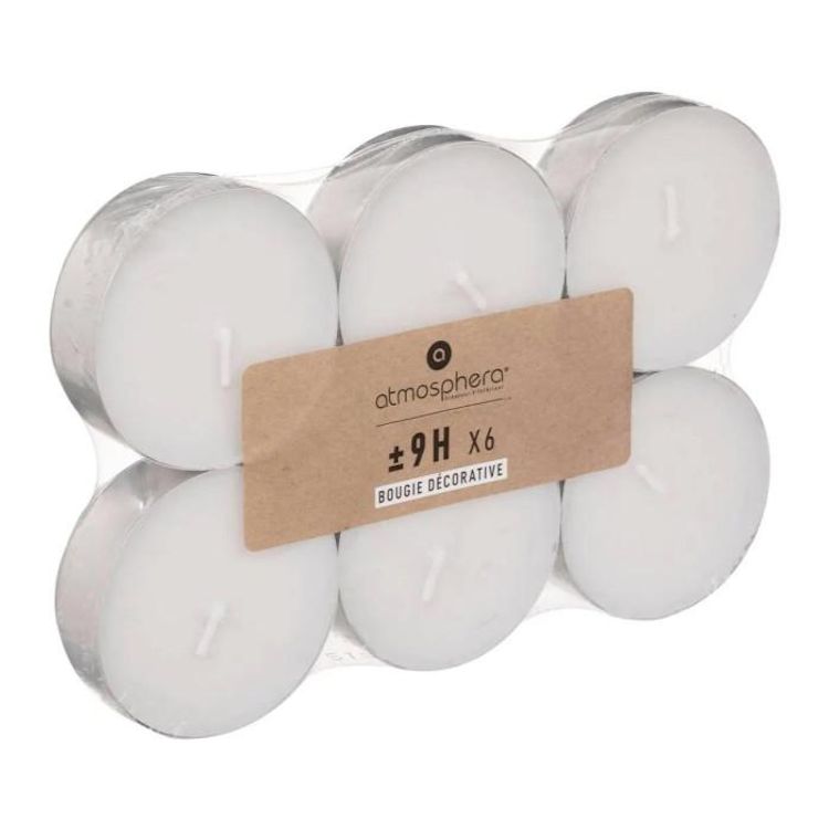 Informations Techniques : Dimensions : D. 5,8 x H. 2,1 cm Matières : Cire & Aluminium Spécificités : Pratique & Déco Coupelle en aluminium 10 heures de combustion Vendu par lot de 6 Poids : 0,234 kg Couleur : Blanc