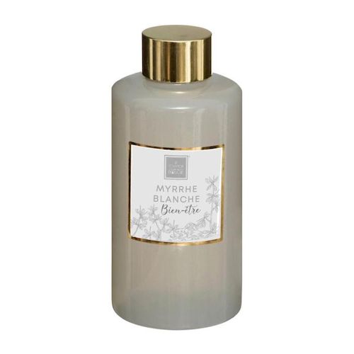Informations Techniques : Dimensions : D. 5,8 x H. 13 cm Matières : Huile & Verre Spécificités : Pratique & Utile Recharge de Diffuseur de Parfum % de parfum : 0,12 Contenance : 200 ml Durée (de combustion, de diffusion) : 7 semaines Senteur : Myrrhe Blanche (une senteur subtile, élégante
