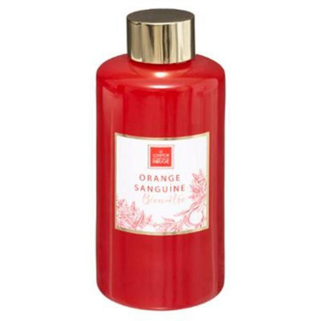 Informations Techniques : Dimensions : D. 5,8 x H. 13 cm Matières : Huile & Verre Spécificités : Pratique & Utile Recharge de Diffuseur de Parfum % de parfum : 0,1 Contenance : 200 ml Durée (de combustion, de diffusion) : 7 semaines Senteur : Orange Sanguine (un parfum frais et vitalisant