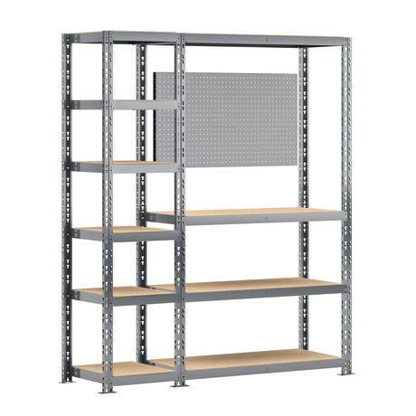 Découvrez le concept rangement de garage MODULÖ STORAGE SYSTEME EXTENSION avec cette étagère double charge lourde 10 plateaux longueur 150 cm comprenant une étagère 6 plateaux 40 x 50 x H.192 cm et une étagère établi 4 plateaux 40 x 100 x H.192 cm livrée avec panneau porte outils. Cette étagère est adaptée aux charges lourdes avec une capacité maximale de 250 kg par plateau. Le montage est facile et se fait par clipsage sans vis ni écrou. Pratique avec sa double utilisation pour rangement boites de conserves, bouteilles, chaussures, livres et petits produits ... et en établi de bricolage avec panneau support outils et étagère de rangement. Structure acier finition peinture époxy. Possibilité d'extension permanente avec toutes les extensions de la gamme MODULÖ STORAGE.