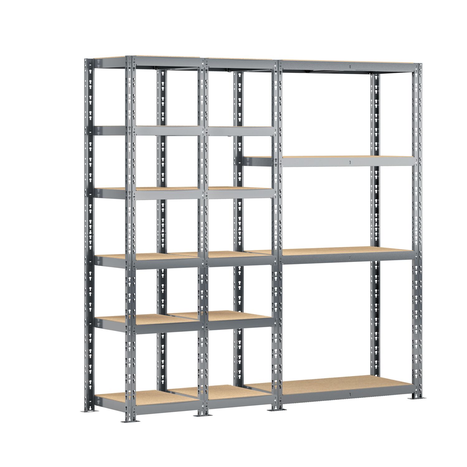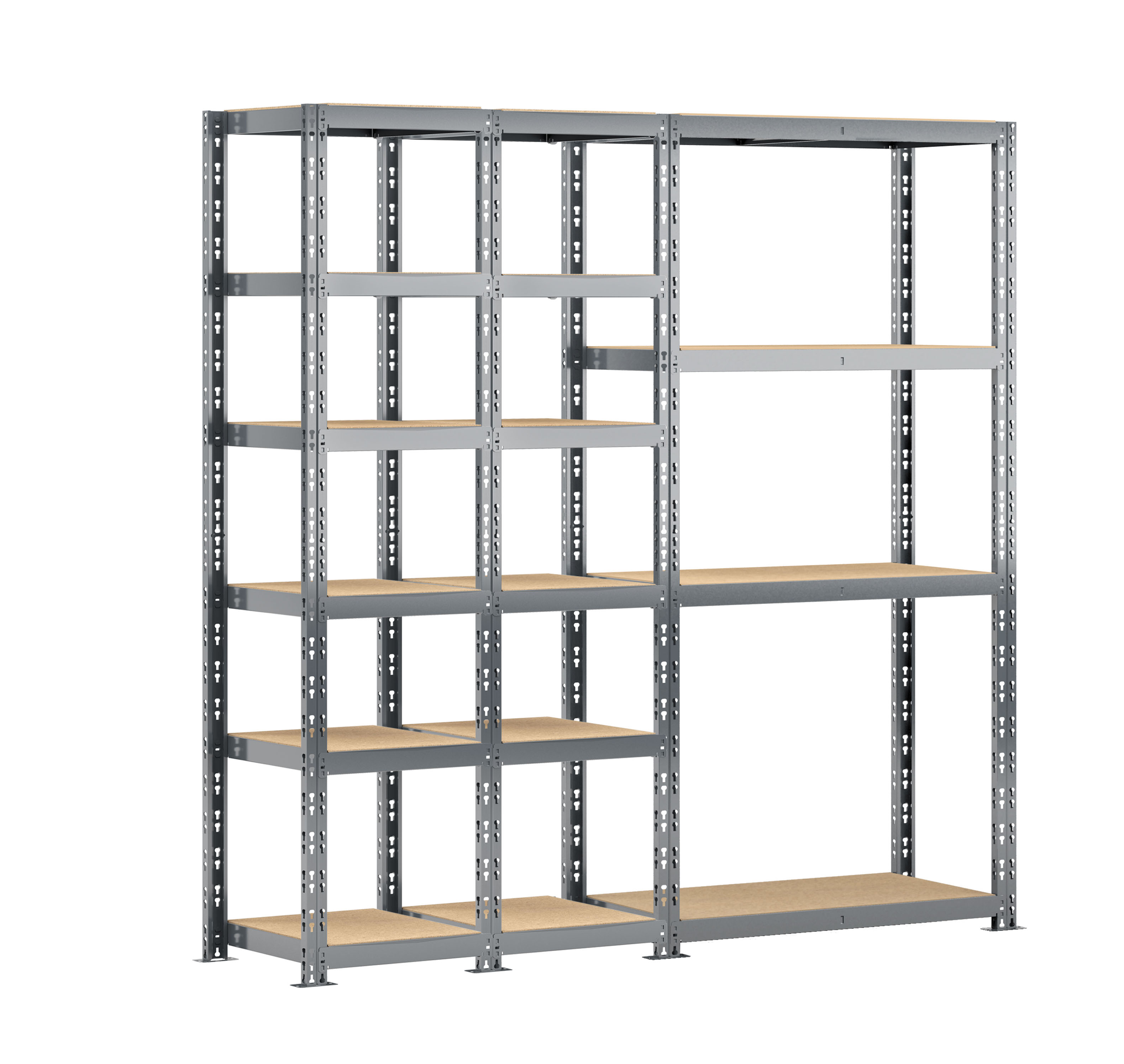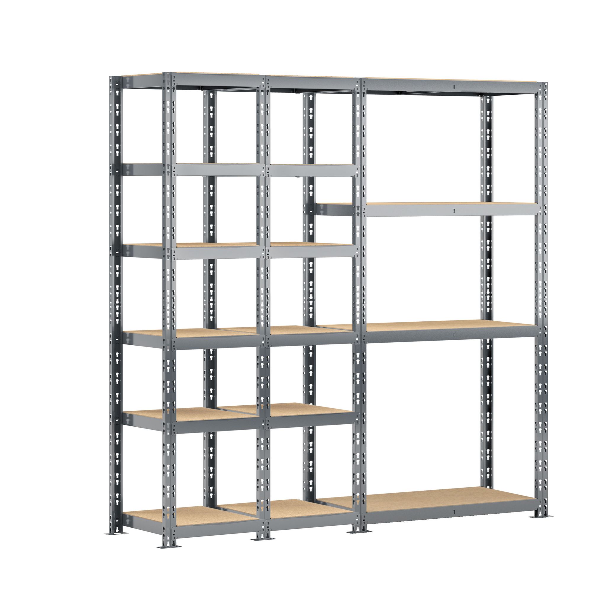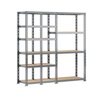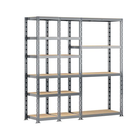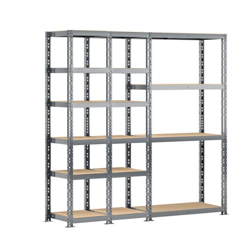 Découvrez le concept rangement de garage MODULÖ STORAGE SYSTEME EXTENSION avec cette étagère triple charge lourde 16 plateaux longueur 200 cm comprenant 2 étagères 6 plateaux 40 x 50 x H.192 cm et une étagère charge lourde 4 plateaux 40 x 100 x H.192 cm. Cette étagère est adaptée aux charges lourdes avec une capacité maximale de 250 kg par plateau. Le montage est facile et se fait par clipsage sans vis ni écrou. Structure acier finition peinture époxy. Pratique avec sa double utilisation pour rangement boites de conserves, bouteilles, chaussures, livres, petits produits et rangement petits et moyens cartons, papier essuie-mains, papier WC. Possibilité d'extension permanente avec toutes les extensions MODULÖ STORAGE.