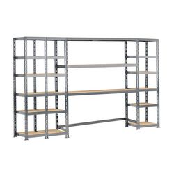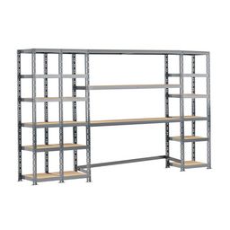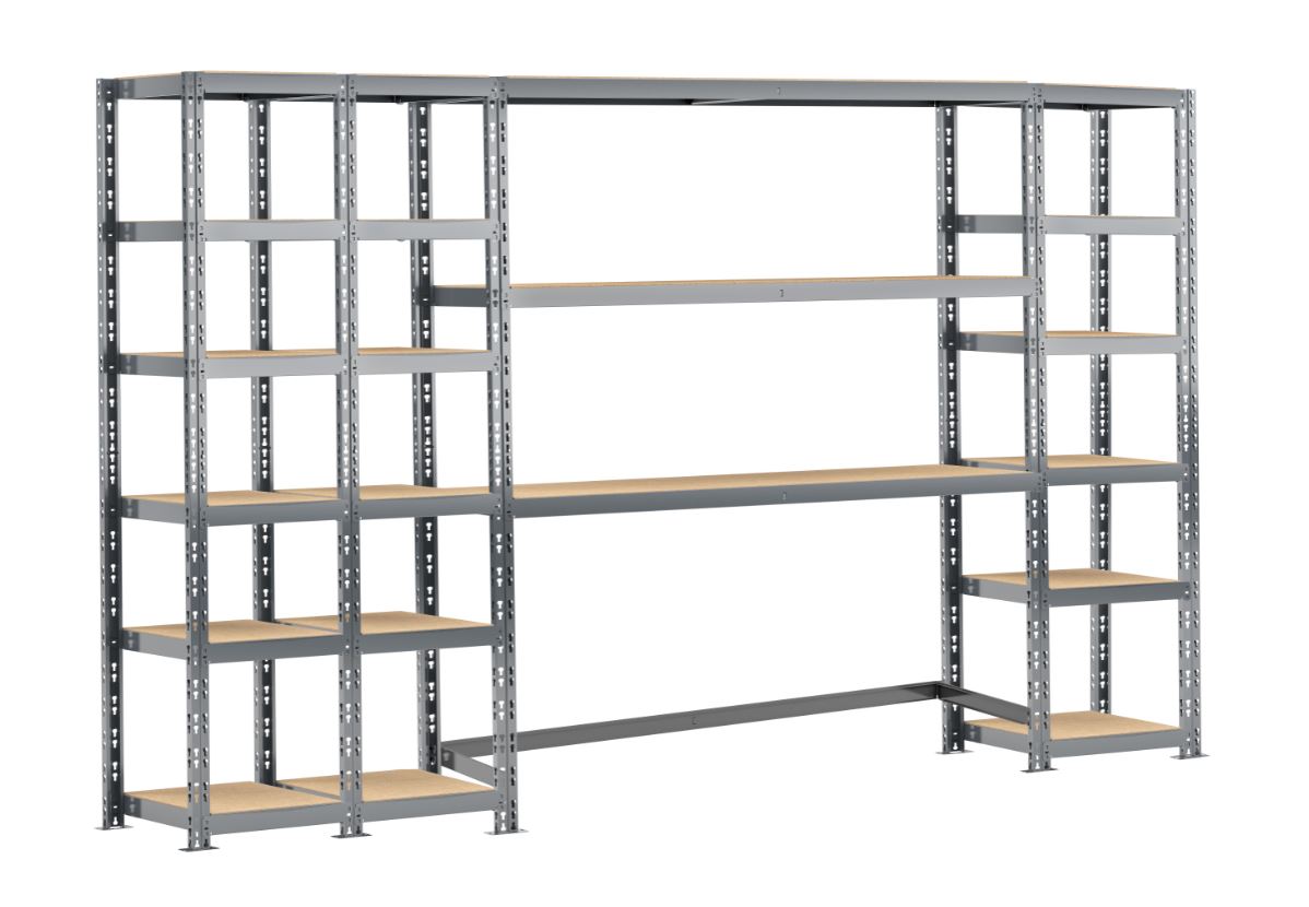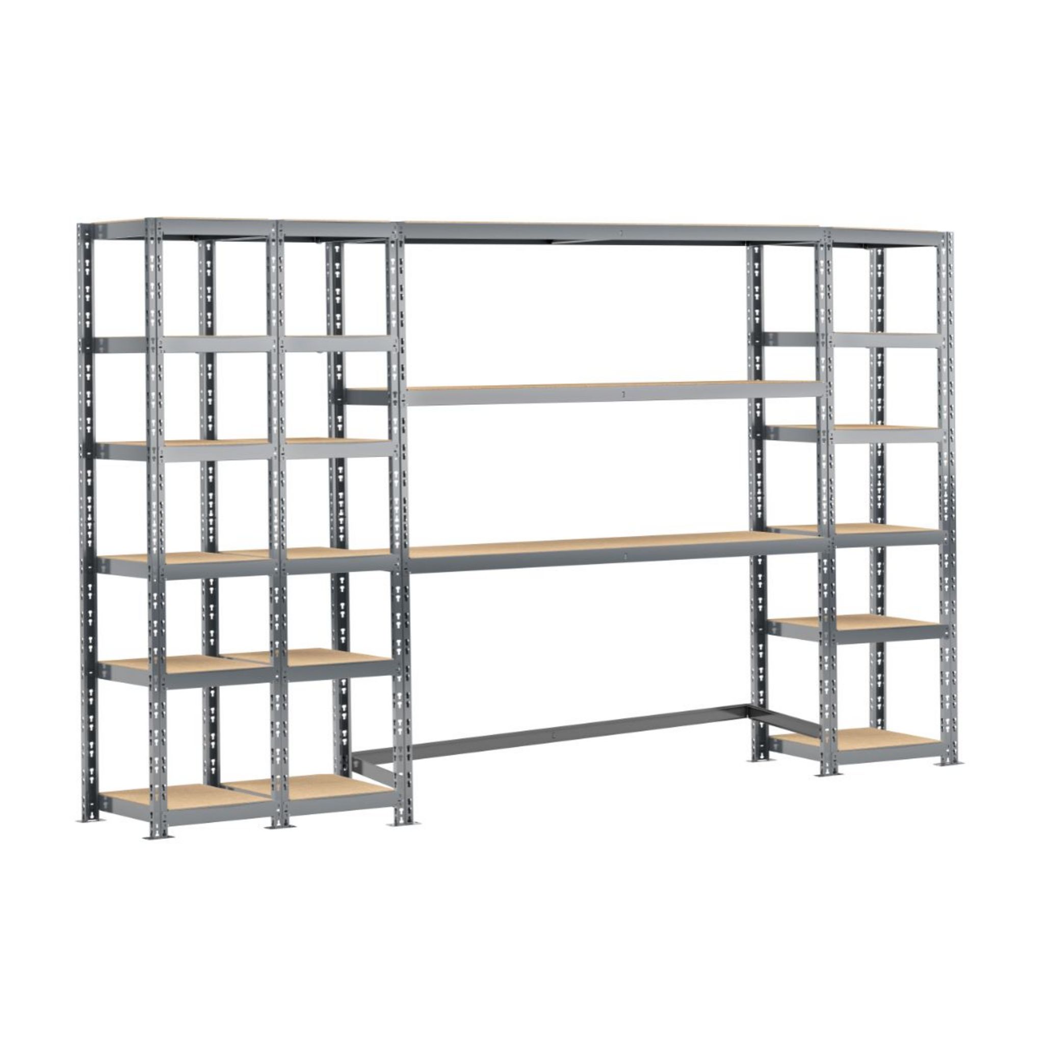 - Etagère quadruple charge lourde 21 plateaux longueur 300 cm comprenant 3 étagères charge lourde 6 plateaux 40 x 50 x H.192 cm et une étagère rack 3 plateaux 40 x 150 x H.192 cm livrée avec montants de renfort au sol anti-écartement.