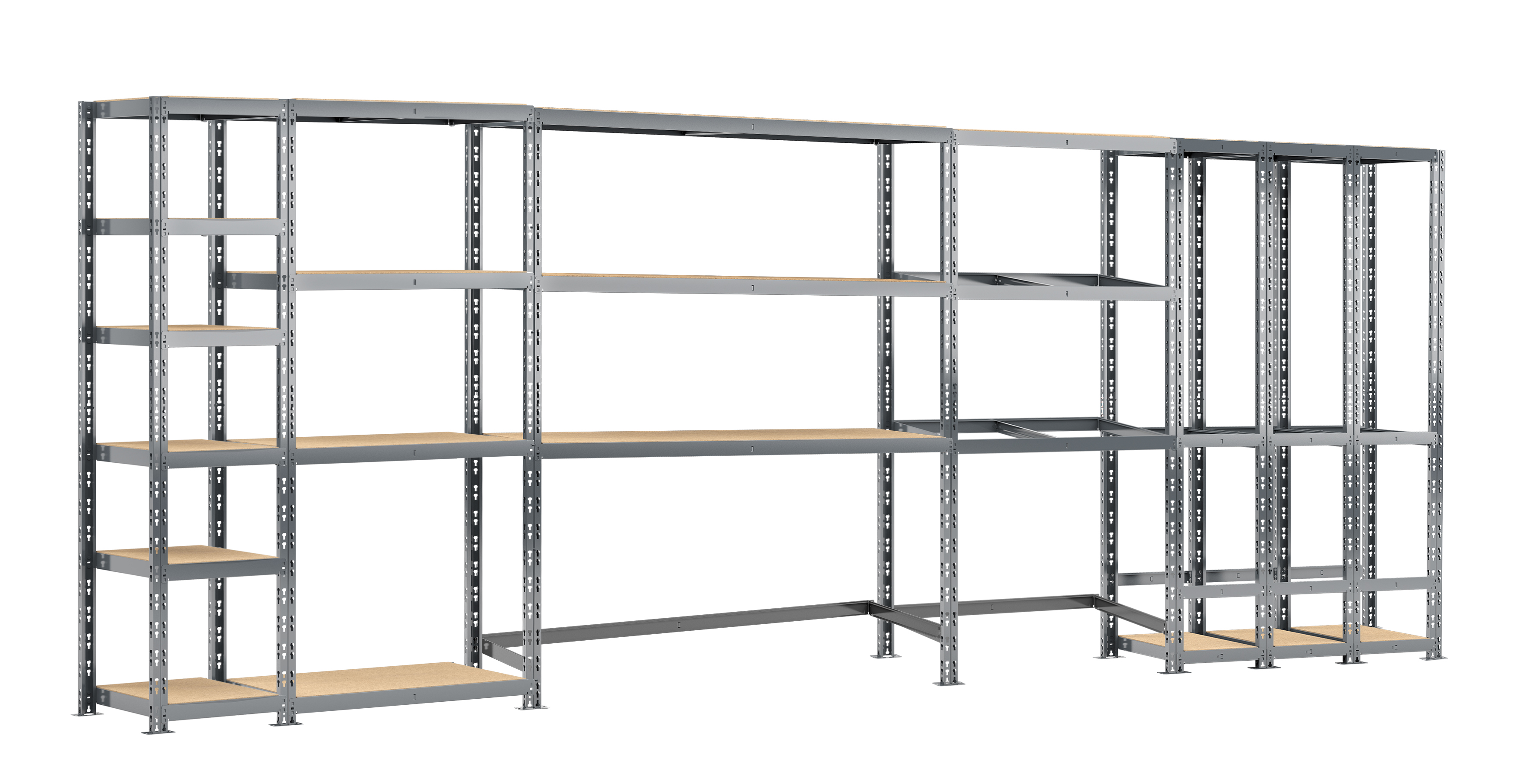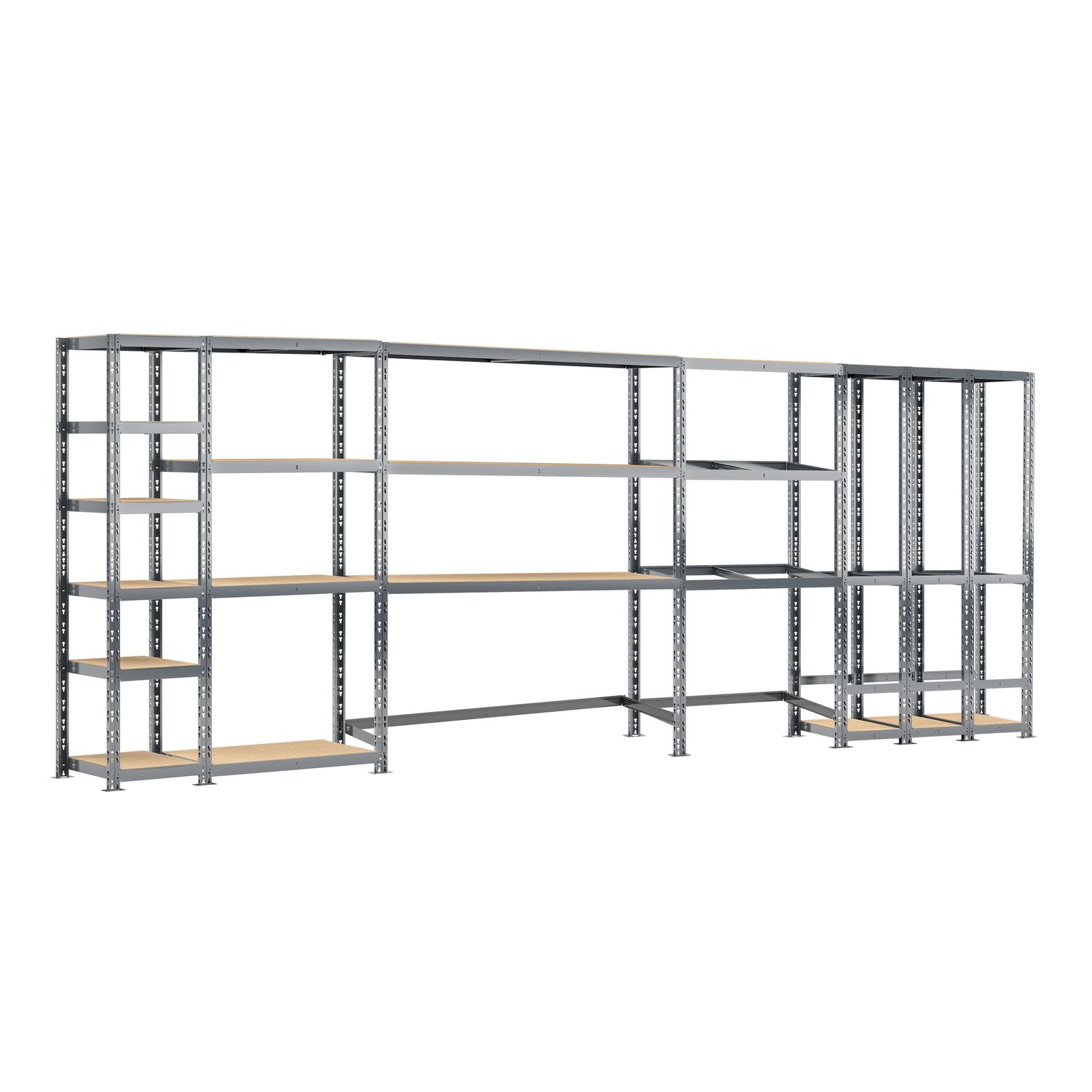 - Etagère quintuple charge lourde 16 plateaux + 3 box longueur 505 cm comprenant une étagère charge lourde 6 plateaux 40 x 50 x H.192 cm et une étagère 4 plateaux dimensions 40 x 100 x H.192 cm et une étagère rack 3 plateaux 40 x 150 x H.192 cm livrée avec montants de renfort au sol anti-écartement et une étagère 3 niveaux dimensions 40 x 100 x H.192 cm pour pneumatique et une étagère de rangement verticale 3 box dimensions 40 x 105 x H.192 cm livrée avec plateaux bas et plateaux hauts.