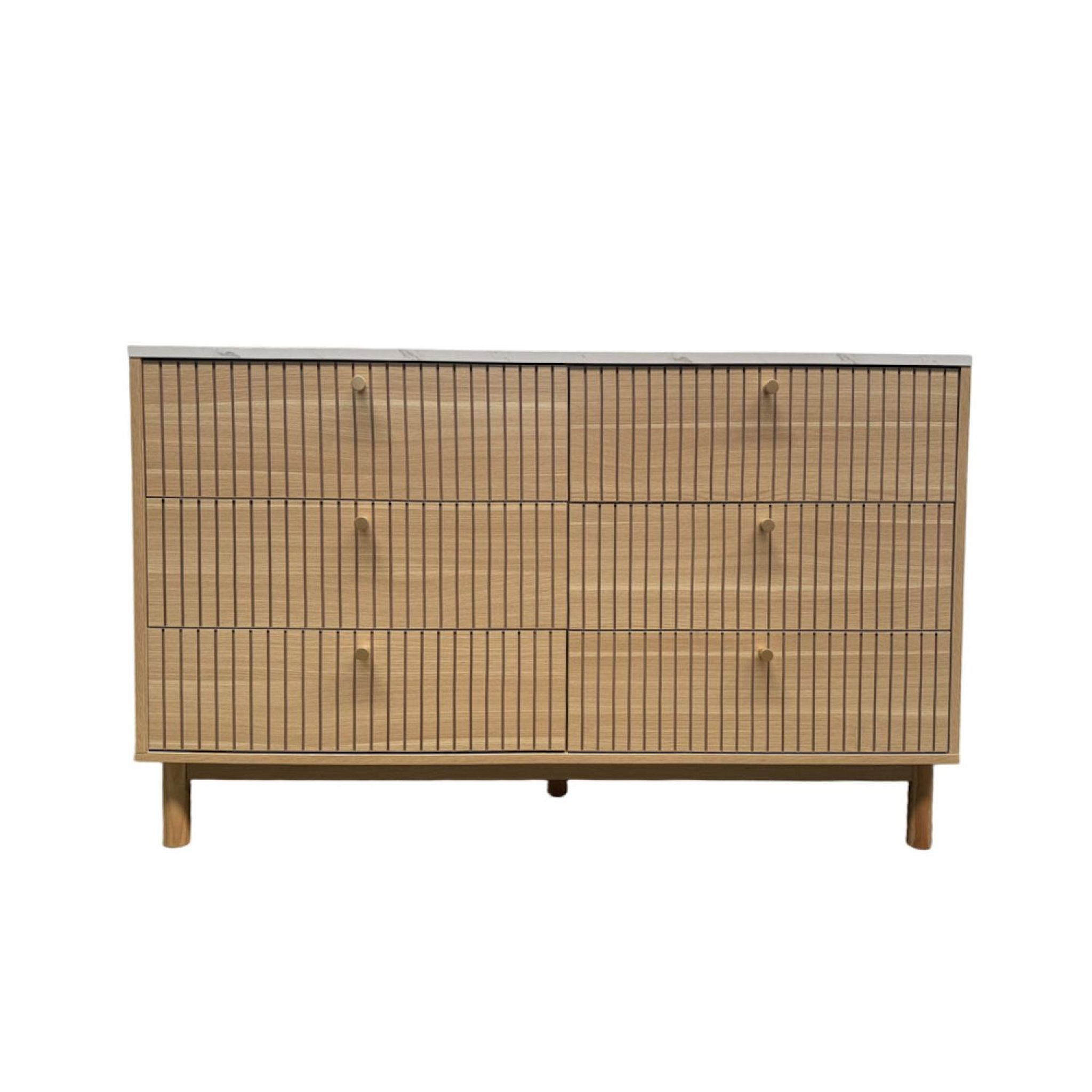 Buffet 6 tiroirs aspect bois rainuré et marbre 120cm BROX