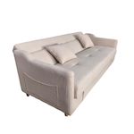Caractéristiques techniques Nombre de places : 3/4 placesCouleur : BeigeForme : DroitType : ConvertibleCoffre sous l'assise : OuiRevêtement : Velours côteléPiètement : BoisSuspensions : Sangles élastiques et ressortsDensité : Mousse recyclée 50 kg/m3 + Nouvelle mousse 25 kg/m3Coussins : 2Pochettes d