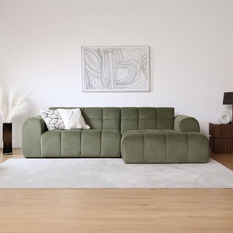 Canapé d'angle 3/4 places nuage en velours vert Un design généreux, tout en rondeur, pensé pour transformer votre salon en cocon de douceur. Avec ses volumes rebondis et sa silhouette enveloppante, ce canapé d'angle s'inspire de l'esthétique bubble pour apporter une note contemporaine et rassurant
