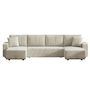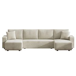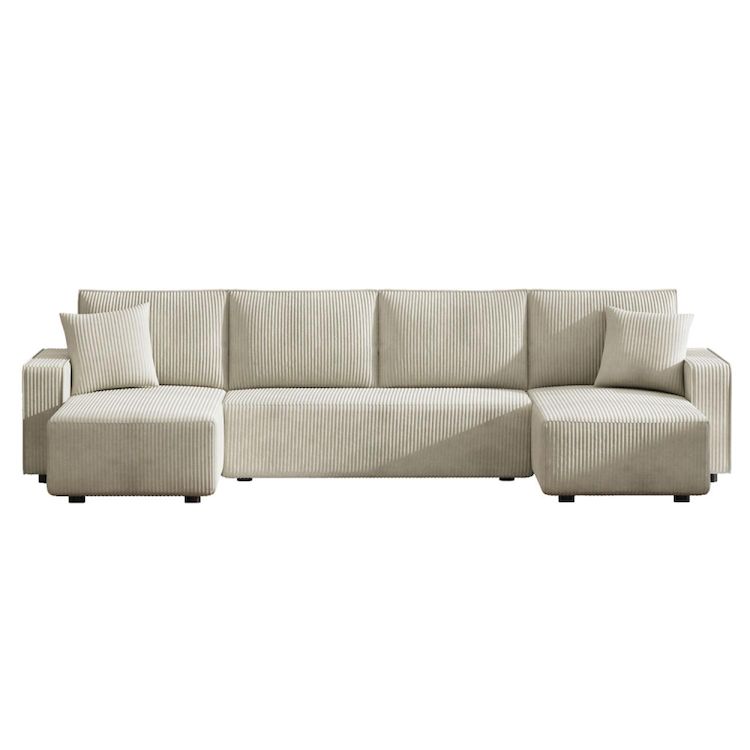 Caractéristiques techniques Nombre de places : 6 placesCouleur : BeigeForme : Panoramique, 2 méridiennesMéridienne : Droite et gaucheType : ConvertibleDensité : FermeRevêtement : Velours côteléStructure : Bois massif d'eucalyptus et panneaux de particulesGarnissage : Double épaisseur mousse 50 kg/m3