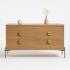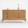 Le piètement en métal noir, légèrement surélevé, allège visuellement la silhouette de la commode tout en facilitant le nettoyage au sol. Sa structure basse et allongée s'adapte aussi bien à une chambre qu'à un couloir ou un séjour, pour créer une zone de rangement chic et ordonnée.