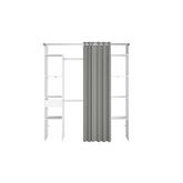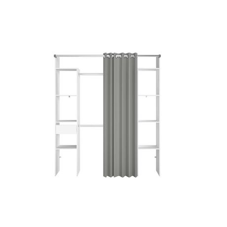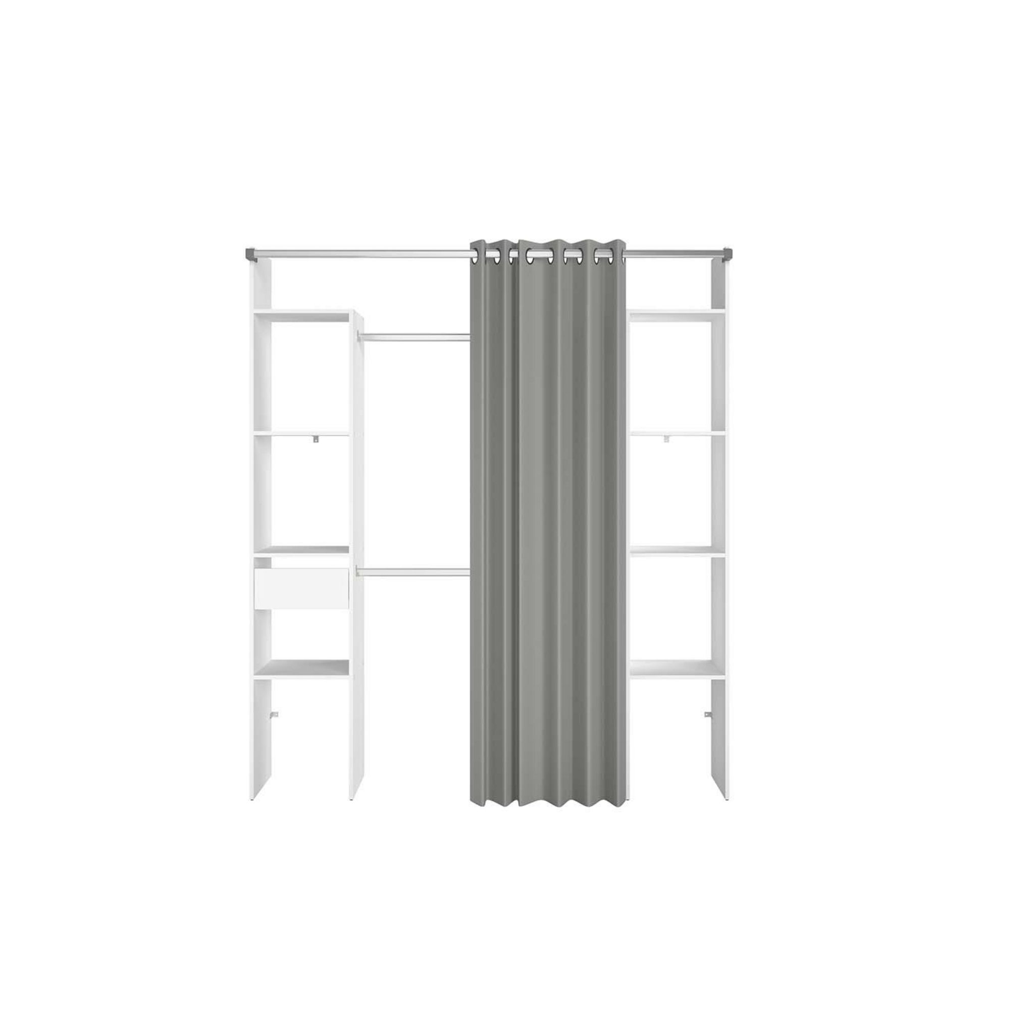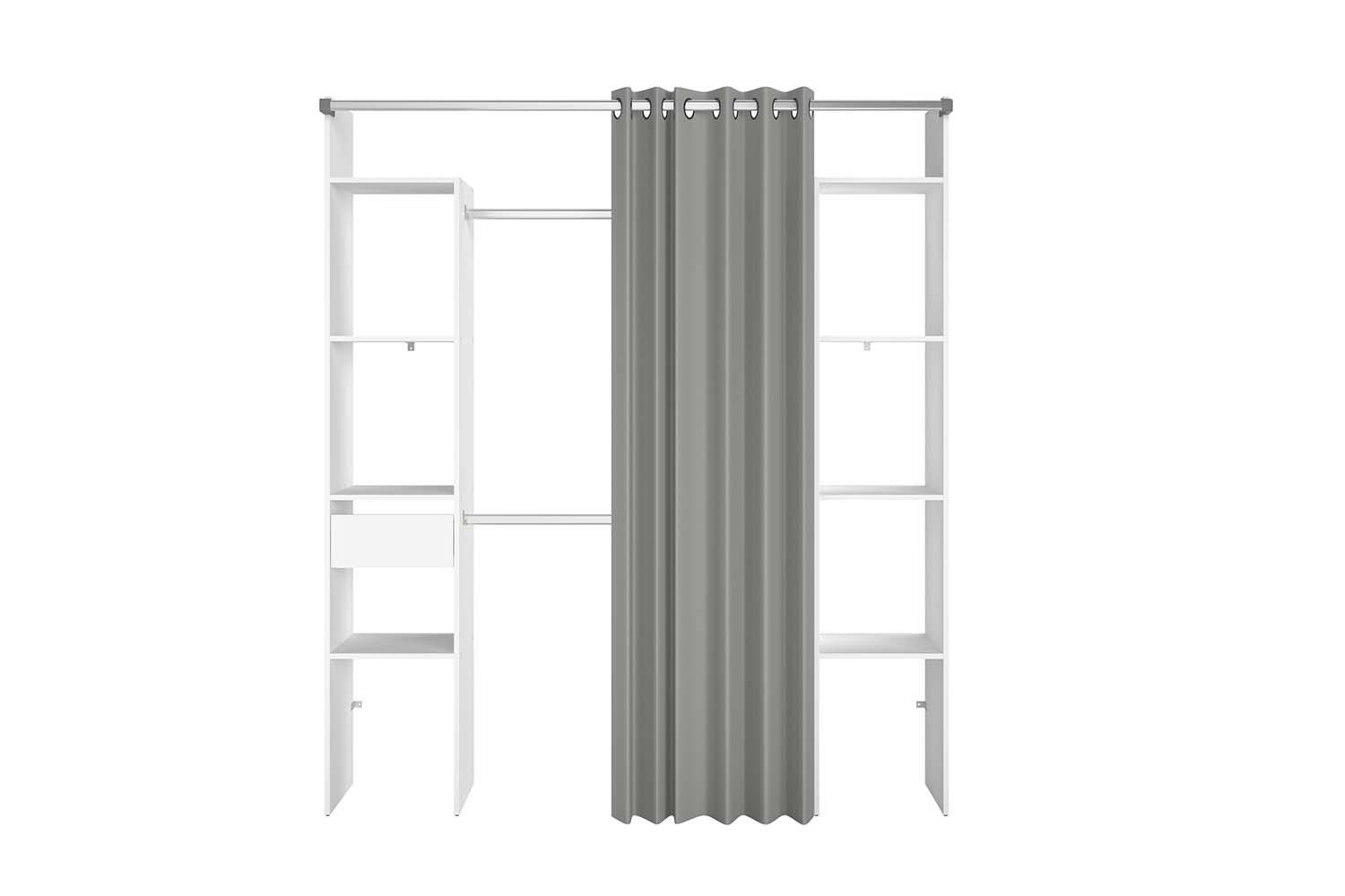 Dressing blanc avec rideau gris et 2 penderies, 6 etagères et un tiroir