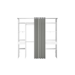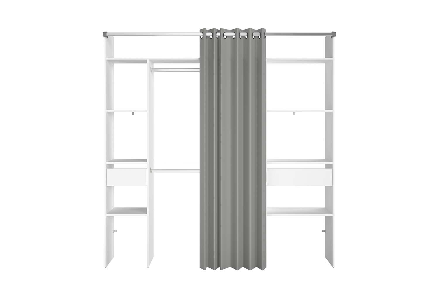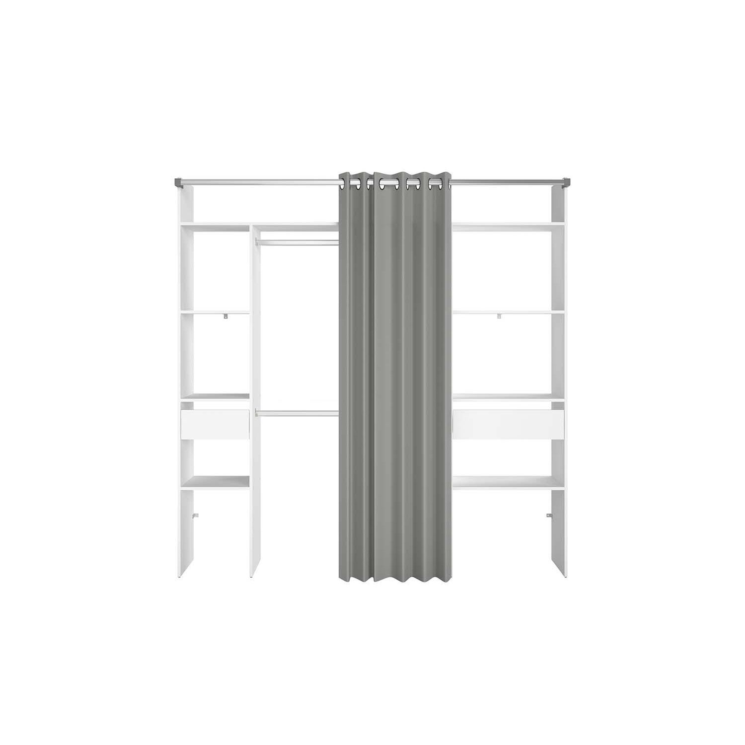 Dressing blanc avec rideau gris 2 penderies, 6 étagères 2 tiroirs ELYSEE