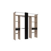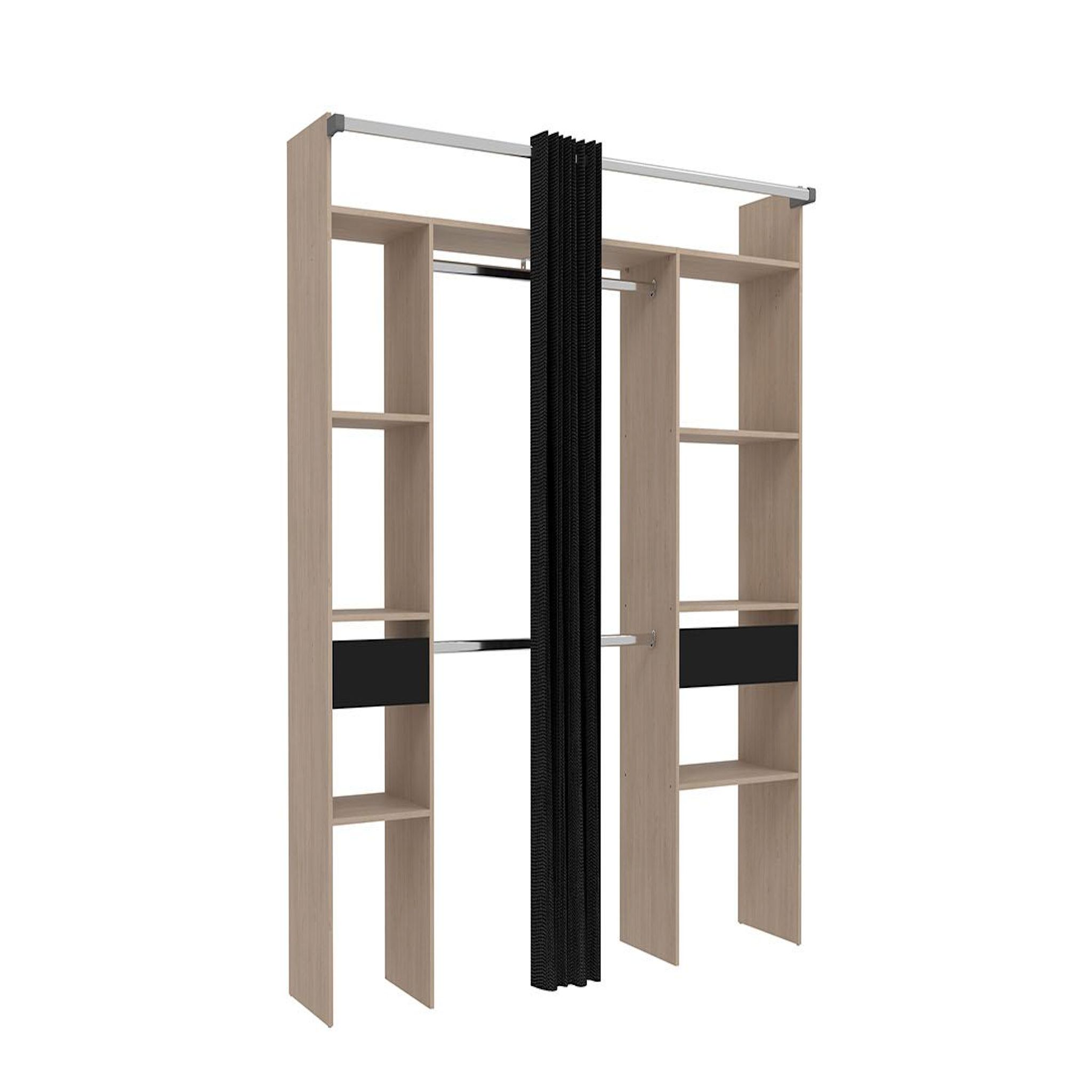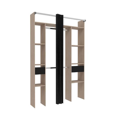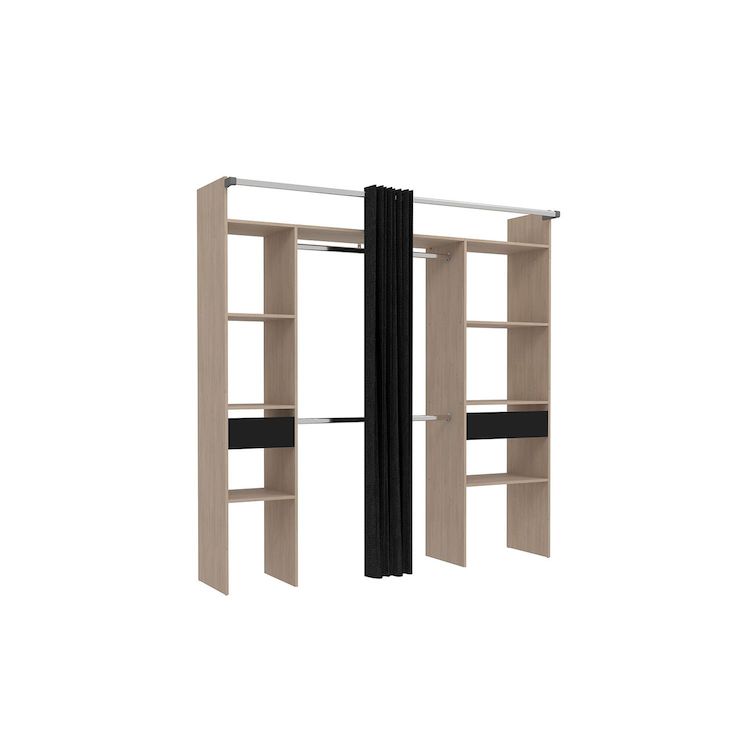 Dressing bois avec rideau noir et 2 penderies, 6 étagères et 2 tiroirs ELYSEE