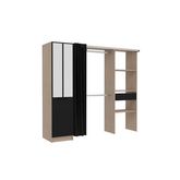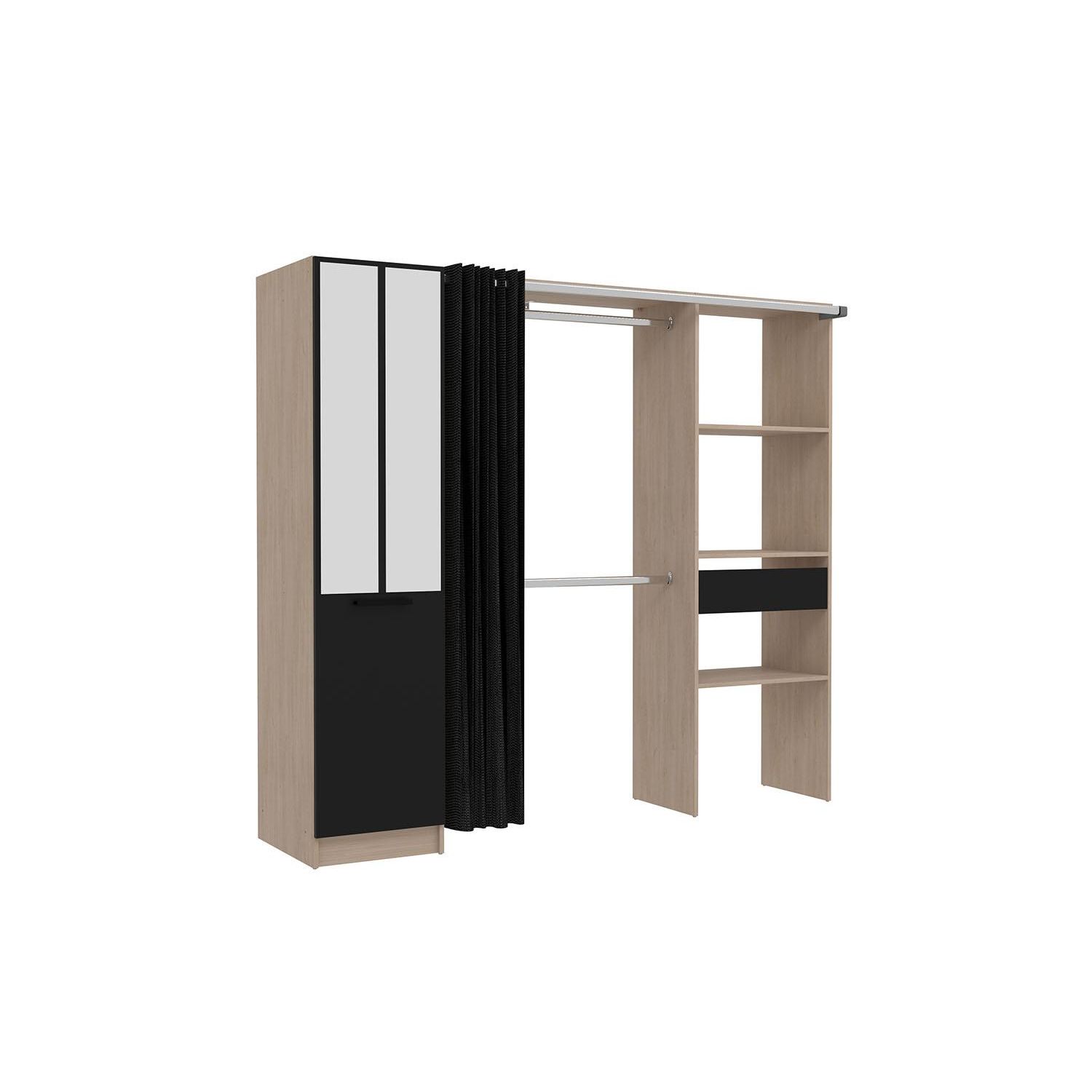 Dressing industriel bois, rideau noir, 2 penderies, 6 étagères et 1 tiroir noir NICE