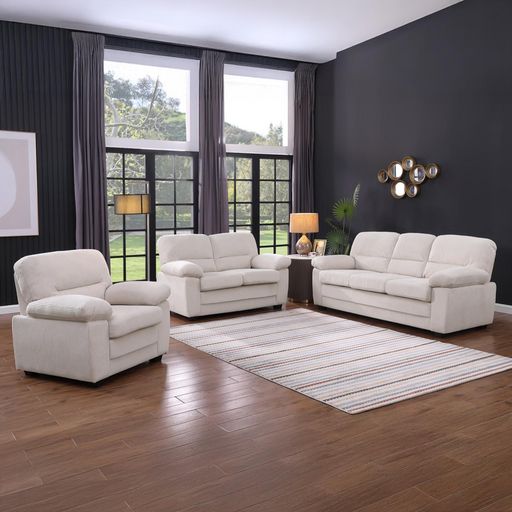 Caractéristiques techniques :Nombre de places : 6Couleur : BeigeType : FixeForme : DroitEnsemble : 1canapé 3 places, 1 canapé 2 places, 1 fauteuilRevêtement : Velours côteléStructure : Cadre en boisGarnissage : Mousse 22 kg / m3Suspensions assise : Sangles élastiqués et ressorts ensachésCoussins dé