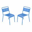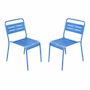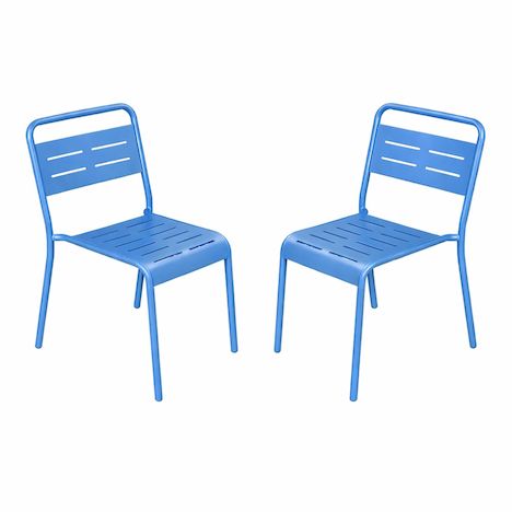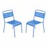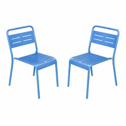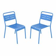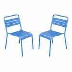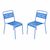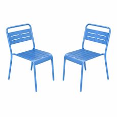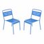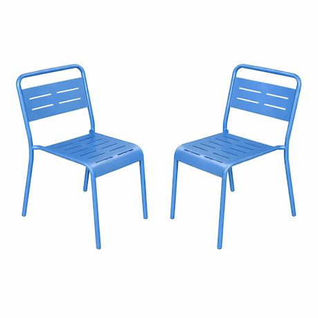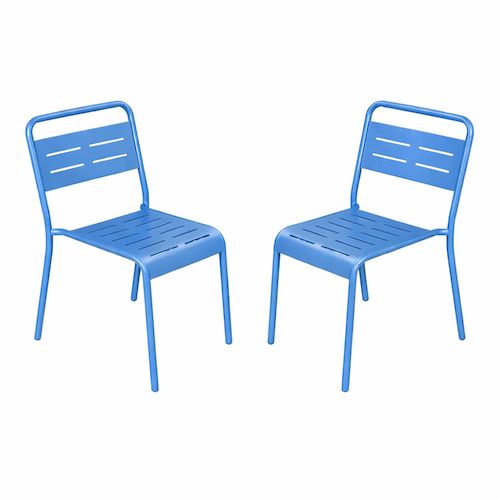 Caractéristiques techniques Nombre de chaises : 2Type : Chaises de jardinCouleur principale : BleuMatière : Acier thermolaquéRésistance aux rayons du soleil et à la corrosionRangement facile : chaises empilablesDéperlant : Oui, grâce aux lattes ajouréesChaises vendues sans tableEntretienNettoyez ave