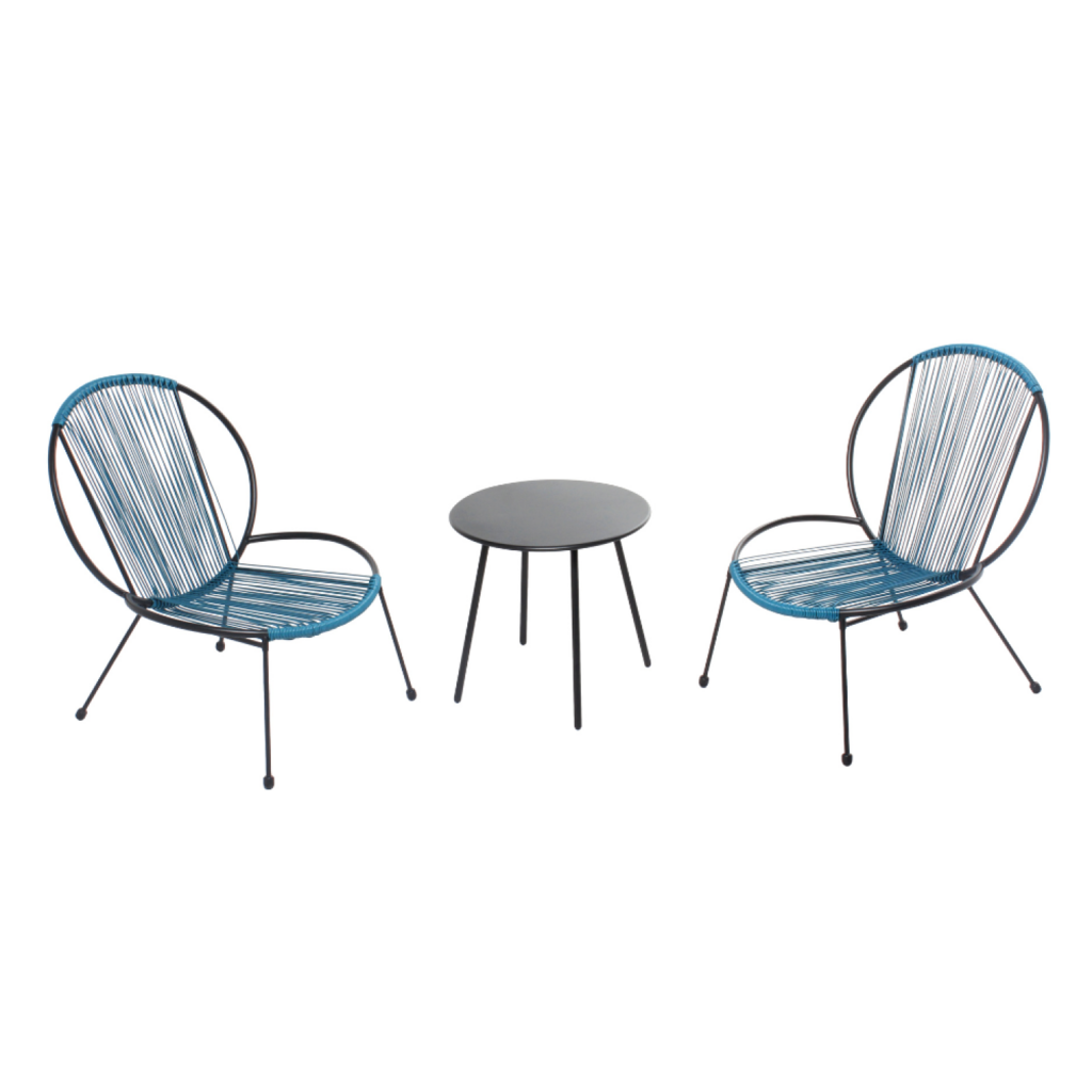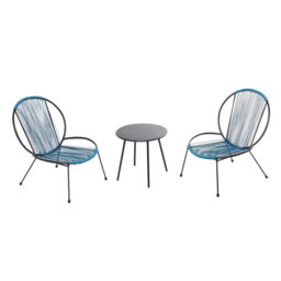 Caractéristiques techniques :Couleur Principale : BleuCouleur Secondaire : NoirStructure de la table et des fauteuils : AcierFinition poudre epoxy sur table et fauteuilsEnsemble design et retroAssise confortableTable basse très pratiqueDimensions :Table : 50 x 48 cmFauteuils : 64 x 77 x 80 cmCondit
