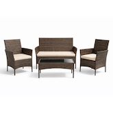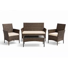 Caractéristiques techniques Couleur : Marron et beigeNombre de places : 4 placesComposition : 1 canapé, 2 fauteuils, 1 table basseRevêtement : Résine tresséeStructure : AcierCoussins : AmoviblesNombre de coussins : 3Plateau de la table basse : Verre trempé noirPoids maximum supporté par le canapé :