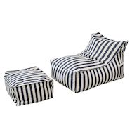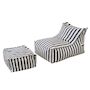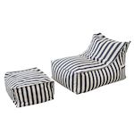 Caractéristiques techniques Couleur : Motif rayures bleuType : Assise relaxationConfort : Assise souple et enveloppanteRevêtement : Tissu spécial extérieurGarnissage : Billes de polystyrène expansé recycléDensité garnissage : 3 à 5 mmTraitement : Déperlant, résistant à l'eauEmpilable : Oui, rangemen