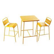 Caractéristiques techniques Ensemble composé de : 1 table de bar + 2 chaises hautesNombre de chaises : 2Type : Chaises de jardinCouleur principale : JauneMatière : Acier thermolaquéRésistance aux rayons du soleil et à la corrosionDéperlant : Oui, grâce aux lattes ajouréesEntretienNettoyez avec un ch
