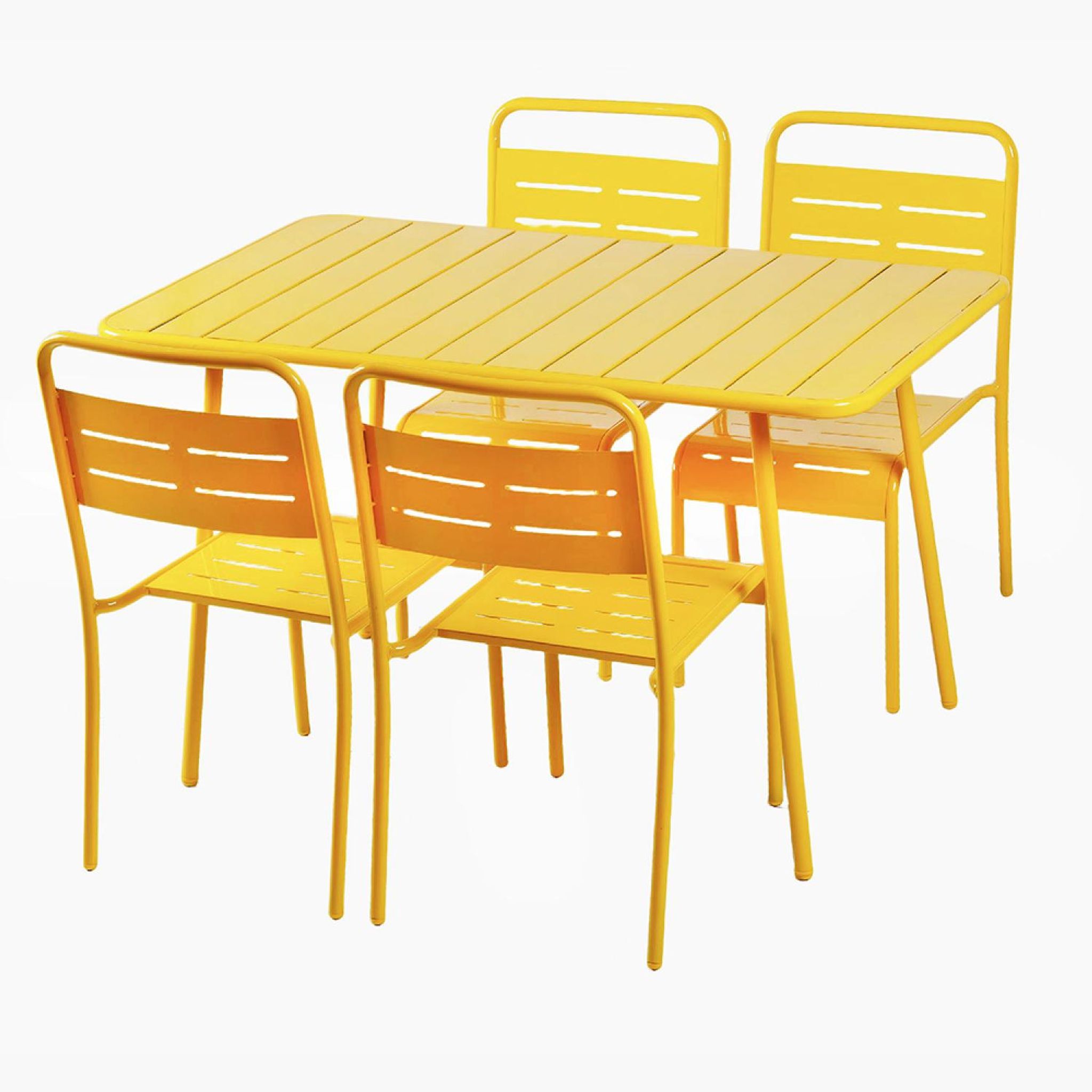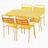 Caractéristiques techniques Nombre de chaises : 4Capacité : Jusqu'à 6 personnesTable : RectangleType : Salon de jardinCouleur principale : JauneMatière : Acier thermolaquéRésistance aux rayons du soleil et à la corrosionRangement facile : Chaises empilablesDéperlant : Oui, grâce aux lattes ajouréesE