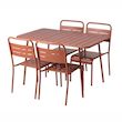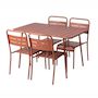 Caractéristiques techniques Nombre de chaises : 4Capacité : Jusqu'à 6 personnesTable : RectangleType : Salon de jardinChaises fournies : OuiCouleur principale : TerracottaMatière : Acier thermolaquéRésistance aux rayons du soleil et à la corrosionRangement facile : Chaises empilablesDéperlant : Oui,