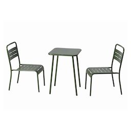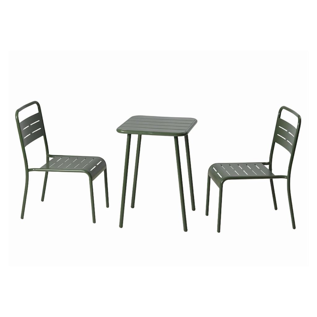 Caractéristiques techniques Nombre de chaises : 2Table : CarréeType : Salon de jardinCouleur principale : VertMatière : Acier thermolaquéRésistance aux rayons du soleil et à la corrosionRangement facile : Chaises empilablesDéperlant : Oui, grâce aux lattes ajouréesEntretienNettoyez avec un chiffon s