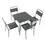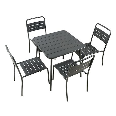 Caractéristiques techniques Nombre de chaises : 4Table : CarréeType : Salon de jardinCouleur principale : Gris foncéMatière : Acier thermolaquéRésistance aux rayons du soleil et à la corrosionRangement facile : Chaises empilablesDéperlant : Oui, grâce aux lattes ajouréesEntretienNettoyez avec un chi