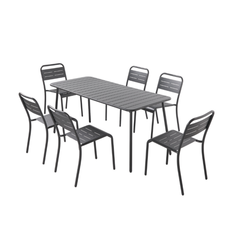 L'ensemble table et chaises Bergame est conçu pour accueillir jusqu'à 6 personnes dans un style moderne et élégant. Fabriqué en acier gris foncé, cet ensemble apporte une touche contemporaine à votre espace extérieur. La table offre un espace généreux pour les repas en plein air, tandis que les chaises assorties garantissent un confort optimal avec leur design ergonomique. Que ce soit pour partager un repas en famille ou entre amis, l'ensemble Bergame est un choix idéal pour créer un coin repas convivial dans votre jardin ou sur votre terrasse.