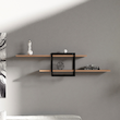 Étagère murale design - 2 rangements - bois et noir Cette étagère murale est la solution idéale pour sublimer vos murs tout en offrant un espace de rangement pratique. Avec ses deux étagères couleur bois de pin et ses finitions noires élégantes, elle apporte une touche moderne à votre pièce. Fonctionnelle, elle est parfaite pour mettre en valeur livres, cadres photo ou petits objets décoratifs. Facile à nettoyer et à installer, elle s'intègre harmonieusement dans tout type d'intérieur, alliant esthétique et utilité. Caractéristiques techniques Couleur principale : Bois (Pin) Couleur secondaire : Noir Matière : Panneaux de particules 100% mélaminé Nombre d'espaces de stockage : 2 Rangements : 2 étagères Entretien Nettoyage facile à l'aide d'un chiffon humide ou sec. Dimensions Dimensions totales : 120 x 30 x 18 cm Dimensions des étagères : 90 x 18 cm Dimensions espaces de stockage entre les deux étagères : 17,2 cm Poids : 8 kg Conditionnement Le produit est conditionné dans 2 colis de : 90 x 22 x 4 cm / 4 kg 34 x 34 x 22 cm / 4 kg Montage facile une notice est fournie. Au choix : Livraison pas de porte gratuite ou livraison à l'étage dans la pièce de votre choix payante.