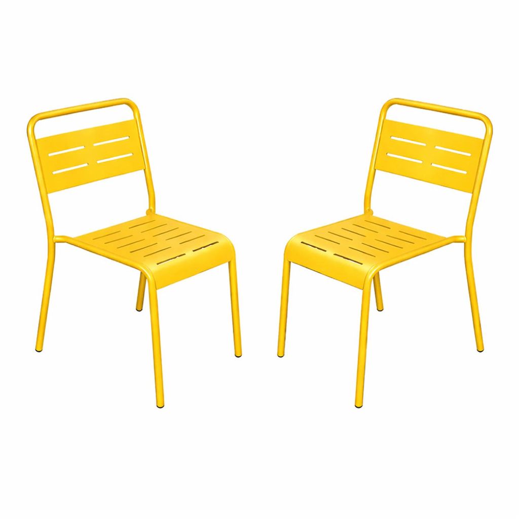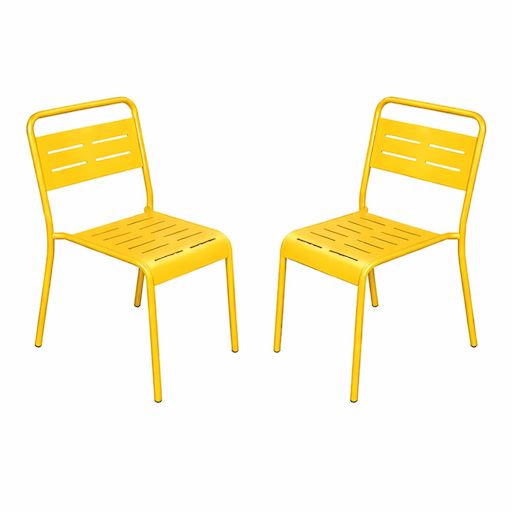Lot de 2 chaises de jardin empilables jaunes Apportez une touche moderne et structurée à votre terrasse, balcon ou jardin avec cet ensemble de 2 chaises au design épuré. Leurs lignes sobres et leur coloris intemporel s'intègrent facilement dans tous les styles d'aménagement extérieur, du patio végétalisé à la terrasse urbaine contemporaine. Elles créent instantanément un espace convivial et élégant, prêt à accueillir vos moments de détente et de partage. Conçues en acier thermolaqué, ces chaises bénéficient d'une finition soignée qui leur assure une excellente résistance aux rayons du soleil et à la corrosion. Leur traitement protège durablement la structure face aux intempéries et aux variations climatiques, pour un mobilier qui conserve son allure saison après saison. Leur assise ergonomique et leur dossier ajouré offrent un confort agréable tout en facilitant l'écoulement de l'eau après une averse. À la fois robustes et légères, elles se déplacent facilement selon vos besoins, que ce soit pour compléter une grande tablée ou aménager un coin détente. Pratiques au quotidien, ces chaises sont empilables, vous permettant de les ranger rapidement et d'optimiser votre espace lorsque vous ne les utilisez pas. Fonctionnelles, durables et élégantes, elles sont le choix idéal pour sublimer votre extérieur avec simplicité et efficacité. Caractéristiques techniques Nombre de chaises : 2 Type : Chaises de jardin Couleur principale : Jaune Matière : Acier thermolaqué Résistance aux rayons du soleil et à la corrosion Rangement facile : chaises empilables Déperlant : Oui, grâce aux lattes ajourées Chaises vendues sans table Entretien Nettoyez avec un chiffon sec ou légèrement humide puis séchez. Protégez les chaises avec une housse pendant l'hiver ou en cas d'inutilisation prolongée. Dimensions Dimensions d'une chaise (L x P x H) : 43 x 59 x 79 cm Hauteur d'assise : 40 cm Largeur d'assise : 37 cm Charge maximale supportée par une chaise : 120 kg Poids d'une chaise : 4,3 kg Conditionnement Le produit est conditionné dans 1 colis de : 62 x 44 x 83,5 cm / 16,8 kg Montage facile une notice est fournie. * Livraison pas de porte offerte * Garantie 2 ans Au choix : Livraison pas de porte gratuite ou livraison à l'étage dans la pièce de votre choix payante.