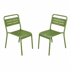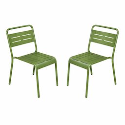 Lot de 2 chaises de jardin empilables vertes Apportez une touche moderne et structurée à votre terrasse, balcon ou jardin avec cet ensemble de 2 chaises au design épuré. Leurs lignes sobres et leur coloris intemporel s'intègrent facilement dans tous les styles d'aménagement extérieur, du patio végétalisé à la terrasse urbaine contemporaine. Elles créent instantanément un espace convivial et élégant, prêt à accueillir vos moments de détente et de partage. Conçues en acier thermolaqué, ces chaises bénéficient d'une finition soignée qui leur assure une excellente résistance aux rayons du soleil et à la corrosion. Leur traitement protège durablement la structure face aux intempéries et aux variations climatiques, pour un mobilier qui conserve son allure saison après saison. Leur assise ergonomique et leur dossier ajouré offrent un confort agréable tout en facilitant l'écoulement de l'eau après une averse. À la fois robustes et légères, elles se déplacent facilement selon vos besoins, que ce soit pour compléter une grande tablée ou aménager un coin détente. Pratiques au quotidien, ces chaises sont empilables, vous permettant de les ranger rapidement et d'optimiser votre espace lorsque vous ne les utilisez pas. Fonctionnelles, durables et élégantes, elles sont le choix idéal pour sublimer votre extérieur avec simplicité et efficacité. Caractéristiques techniques Nombre de chaises : 2 Type : Chaises de jardin Couleur principale : Vert Matière : Acier thermolaqué Résistance aux rayons du soleil et à la corrosion Rangement facile : chaises empilables Déperlant : Oui, grâce aux lattes ajourées Chaises vendues sans table Entretien Nettoyez avec un chiffon sec ou légèrement humide puis séchez. Protégez les chaises avec une housse pendant l'hiver ou en cas d'inutilisation prolongée. Dimensions Dimensions d'une chaise (L x P x H) : 43 x 59 x 79 cm Hauteur d'assise : 40 cm Largeur d'assise : 37 cm Charge maximale supportée par une chaise : 120 kg Poids d'une chaise : 4,3 kg Conditionnement Le produit est conditionné dans 1 colis de : 62 x 44 x 83,5 cm / 16,8 kg Montage facile une notice est fournie. * Livraison pas de porte offerte * Garantie 2 ans Au choix : Livraison pas de porte gratuite ou livraison à l'étage dans la pièce de votre choix payante.