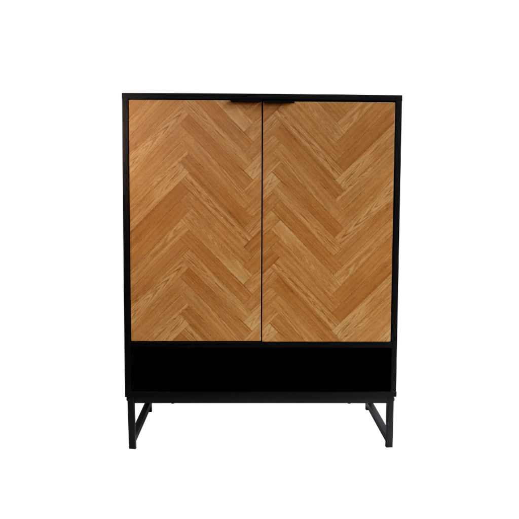 Meuble d'entrée noir et bois chevron avec rangements Le meuble d'entrée Floor allie style et fonctionnalité. En plus de sa structure effet bois avec des accents noirs, il dispose de cinq étagères, dont quatre sont cachées derrière deux portes à l'effet chevron élégant. Ce design moderne offre un esp