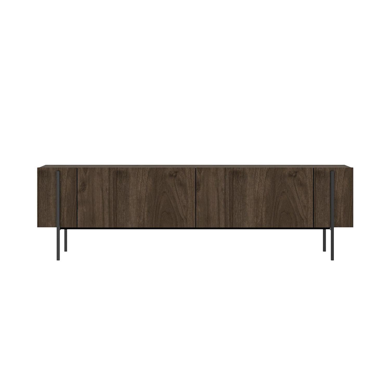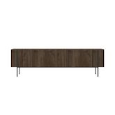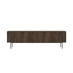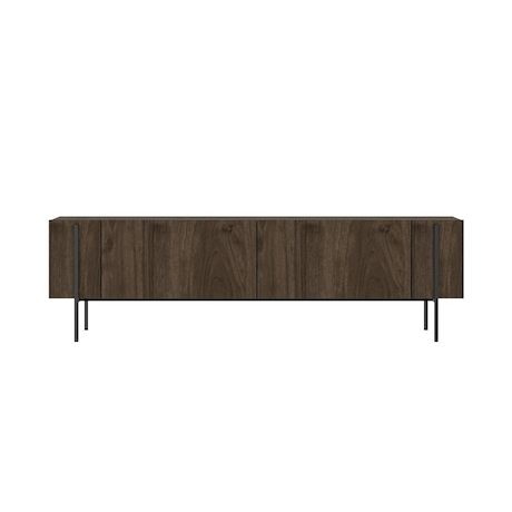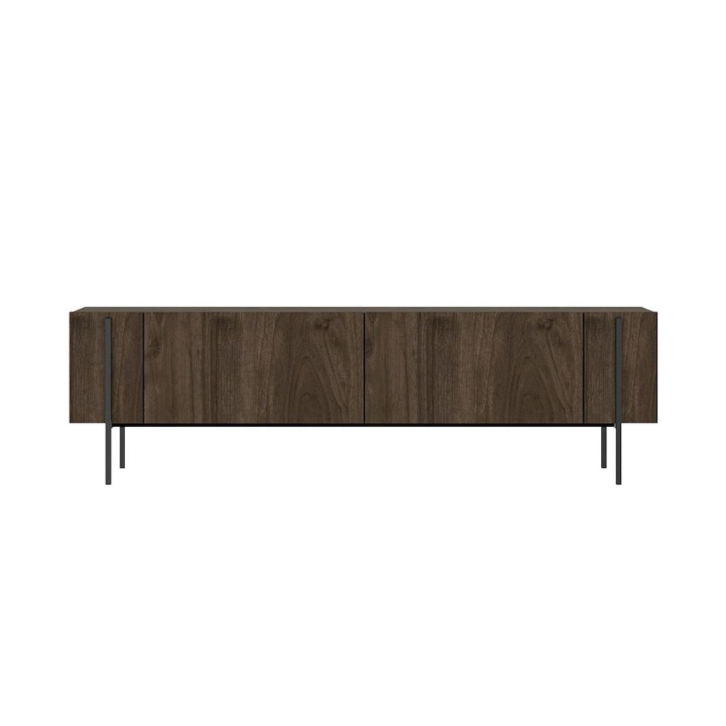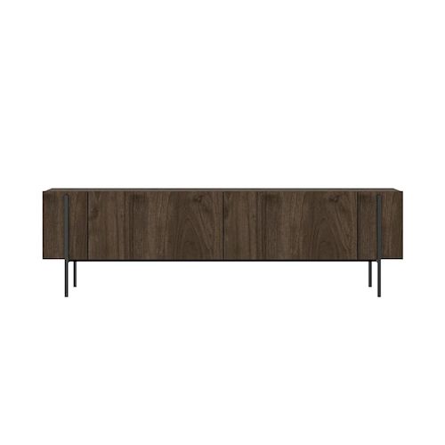 Lignes épurées, allure contemporaine et teinte chaleureuse : ce meuble TV en bois foncé aspect noyer devient immédiatement un point focal dans le salon. Sa silhouette longiligne repose sur une base en métal noir qui lui confère un style résolument moderne, tout en soulignant le raffinement naturel du bois.