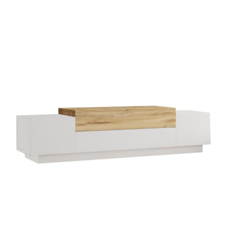 Découvrez Melo, le meuble TV alliant élégance et fonctionnalité. Avec ses 160 cm de longueur, il offre un espace généreux pour votre équipement multimédia. Son design harmonieux associe le blanc et le bois, apportant une touche de modernité à votre salon. Ce meuble est équipé de quatre tiroirs abattants, idéaux pour ranger vos DVD, télécommandes et autres accessoires. Ses deux placards aux extrémités et ses deux placards superposés au centre offrent un espace de rangement supplémentaire pour dissimuler vos câbles et autres objets. Des trous discrets sont prévus à l'arrière du meuble pour permettre le passage des câbles, assurant ainsi un agencement soigné et organisé de votre espace multimédia. Ajoutez une touche de style et d'organisation à votre salon avec le meuble TV Melo.