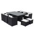 Caractéristiques techniques Salon de jardin Structure : Résine tressée noire Armature : Métallique recouverte de peinture époxy Coussins : Déhoussables en tissu déperlant blancs Éléments modulables : 6 fauteuils encastrables et 4 poufs Table : Bi-matière en résine tressée et verre renforcé 5 mmHous