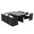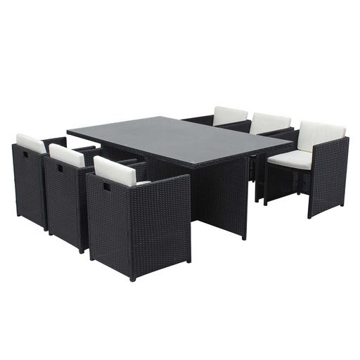 Caractéristiques techniques Salon de jardin Structure : Résine tressée noire Armature : Métallique recouverte de peinture époxy Coussins : Déhoussables en tissu déperlant blancs Éléments modulables : 6 fauteuils encastrables Table : Bi-matière en résine tressée et verre renforcé 5 mmHousse de protec