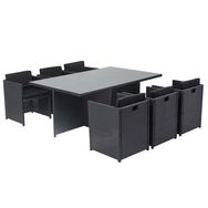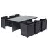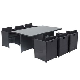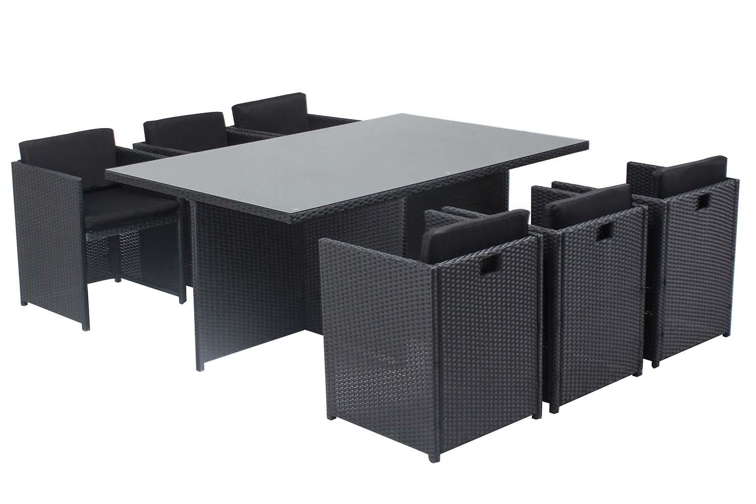 Profitez du même design et des mêmes caractéristiques techniques que le modèle précédent, mais avec des coussins noirs pour une touche d'élégance supplémentaire.Dimensions et conditionnement Table : 180 x 115 x 73 cm Fauteuils : 55 x 55 x 68 cm Housse de protection : 184 x 119 x 70 cm Conditionneme