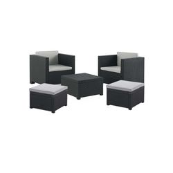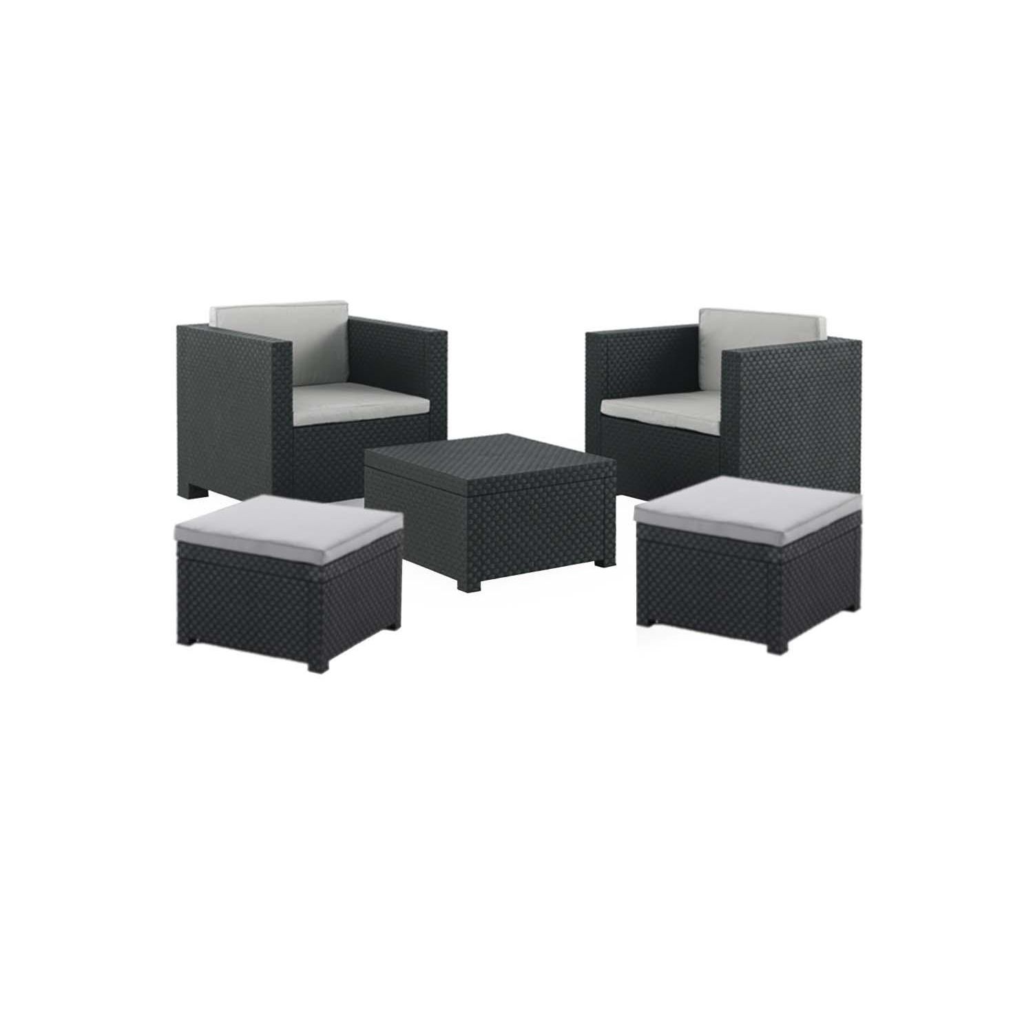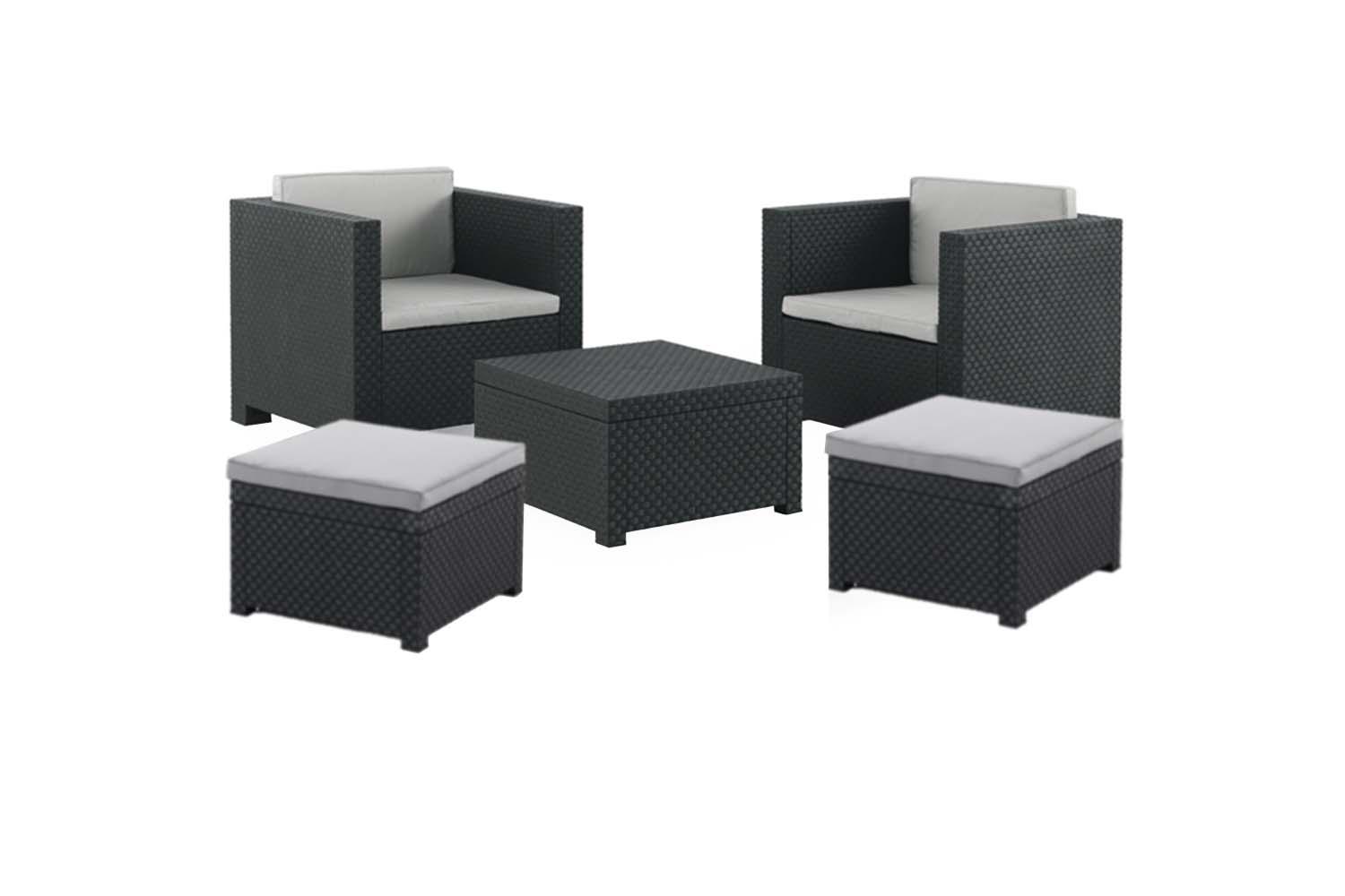 Profitez des journees ensoleillees grâce au salon de jardin 2 places Ankara et ses 2 poufs. Cet ensemble s'adapte tout aussi bien à une utilisation exterieure qu'interieure grâce à sa composition en resine injectee. La salon de jardin fabrique en Espagne est compose à 100% de resine recyclee sans composants metalliques afin d'eviter les problèmes de rouille tout en facilitant son entretien. Son assise est confortable et resistante à l'eau grâce à ses coussins dehoussables, lavables et en tissu deperlant.