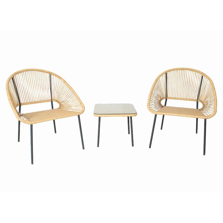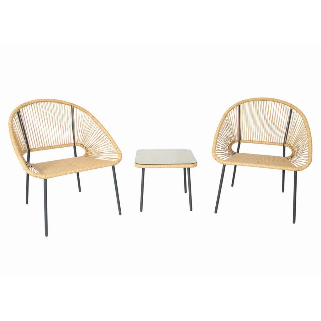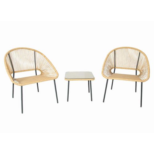 Caractéristiques techniques Nombre de places : 2Couleur : NaturelCouleur structure : NoirMatériaux du fauteuil : Fils de polyéthylèneMatériaux structure : Acier finition poudréePoids maximum supporté par un fauteuil : 120 kgPoids maximum supporté par la table : 22.5 kgEntretienEnlevez régulièrement